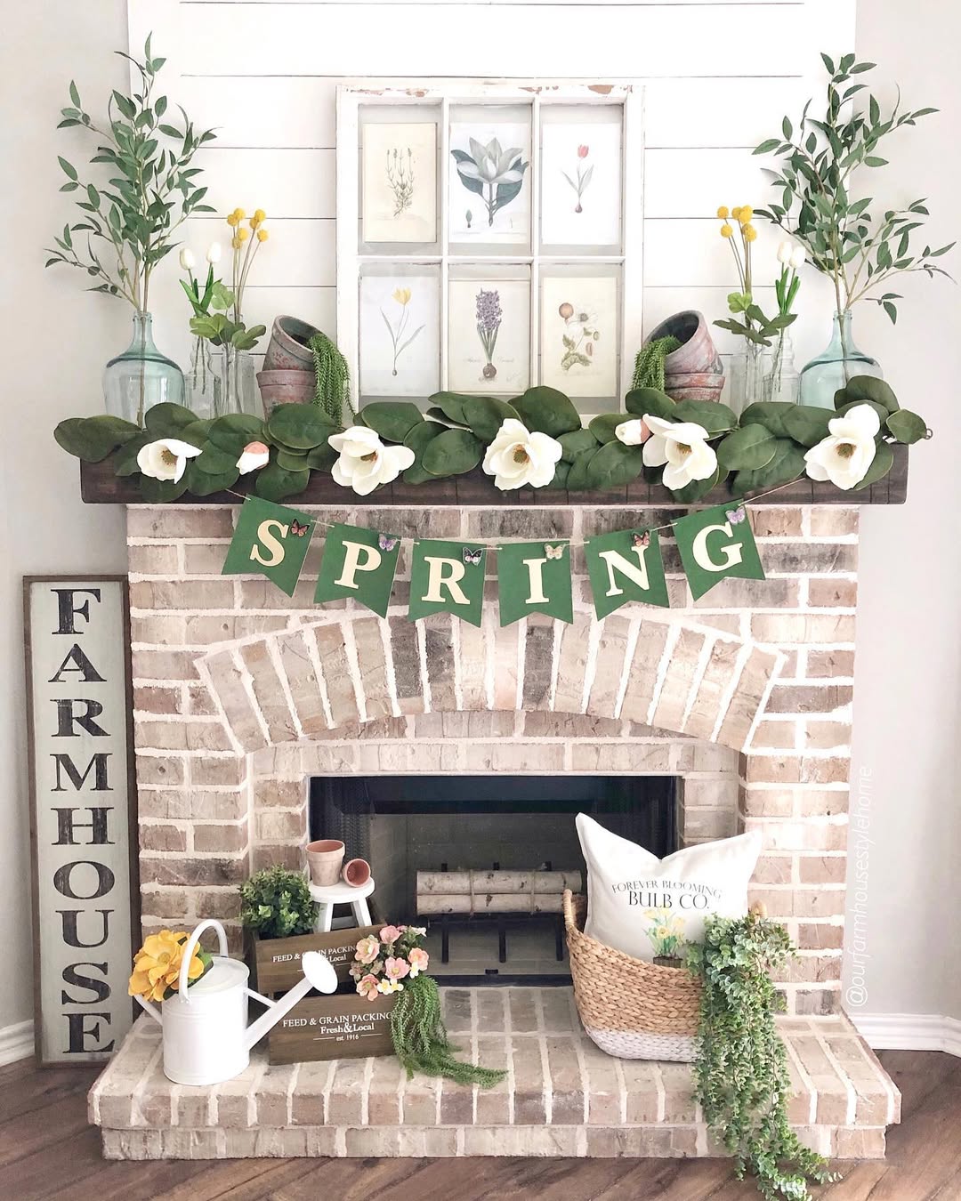 Shiplap walls and pale brick set the stage for this classic seasonal refresh. A thick magnolia garland anchors the mantel and brings lush texture without overpowering the space. The green “SPRING” banner adds a playful, handmade layer that feels market-ready. Balance it all with simple glass vases and stacked pots for that easy, collected farmhouse charm.
