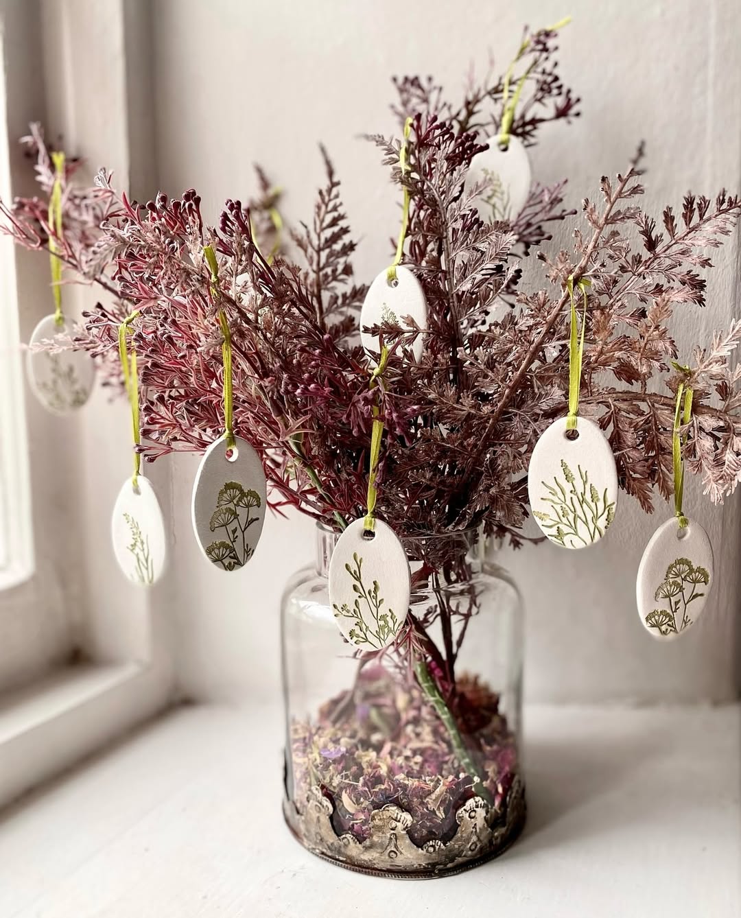 Pressed-flower illustrations turn simple egg shapes into keepsake-worthy decor. The soft ivory clay pops against the moody burgundy foliage for an unexpected spring twist. Bright chartreuse ribbon adds a fresh hit of color and keeps the look from feeling too muted. Hang them at varying heights for a layered, handcrafted display that’s easy to batch and sell.