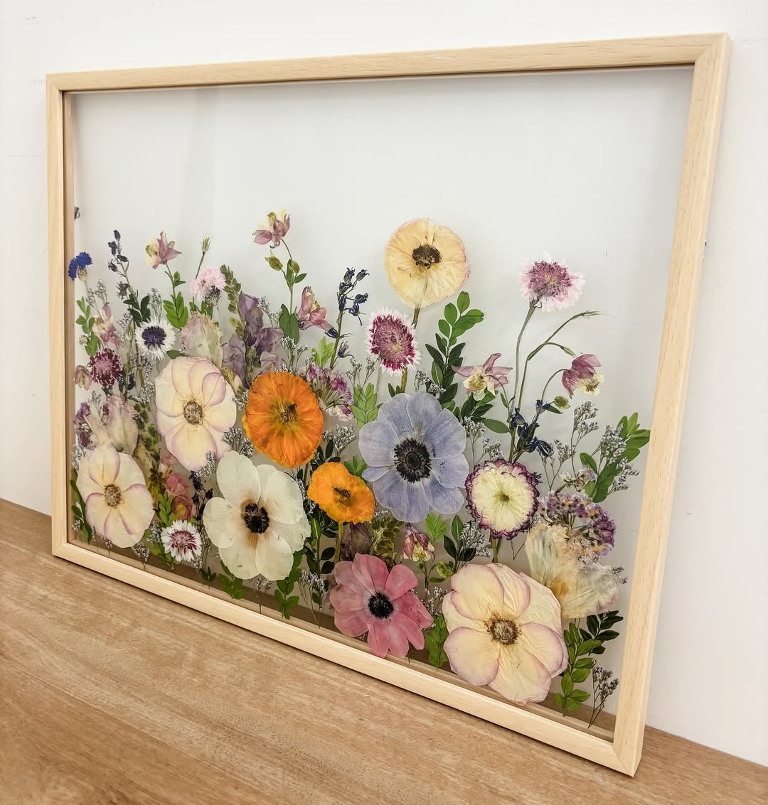 A light wood frame keeps this pressed-flower meadow feeling airy and modern. The blooms rise organically from the base, mimicking how wildflowers actually grow. Soft pastels mix with bold pops of orange and lavender for natural contrast. Leave generous white space up top so the composition can breathe and feel gallery-worthy.