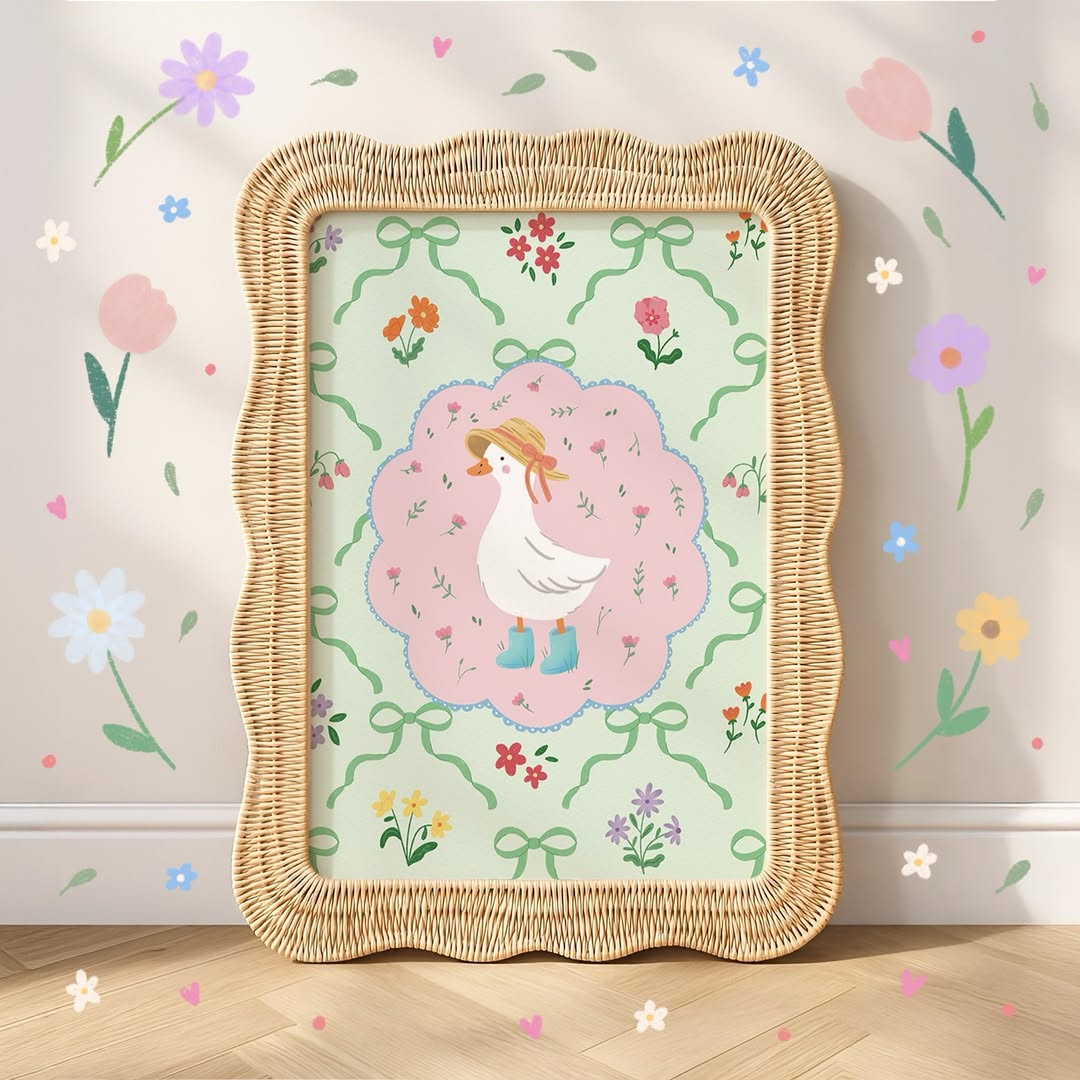 A scalloped rattan frame instantly softens this playful spring print. Pastel florals and looping green bows create a sweet, cottage-inspired pattern that feels handmade. The central duck illustration adds personality without overwhelming the palette. This is the kind of lightweight art piece that’s easy to batch, price accessibly, and watch disappear at a spring market.