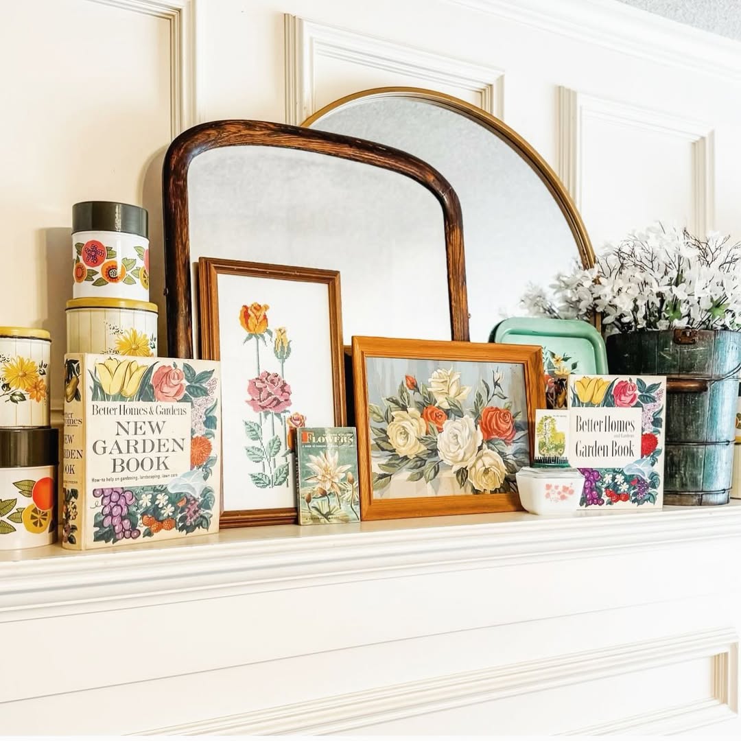 Lean vintage and let the frames tell the story. Warm wood tones and retro garden book covers create instant depth against crisp panel molding. Mixing mirrors, tins, and floral prints keeps the lineup feeling collected rather than staged. The key is layering heights so every bloom gets its moment on the mantel.
