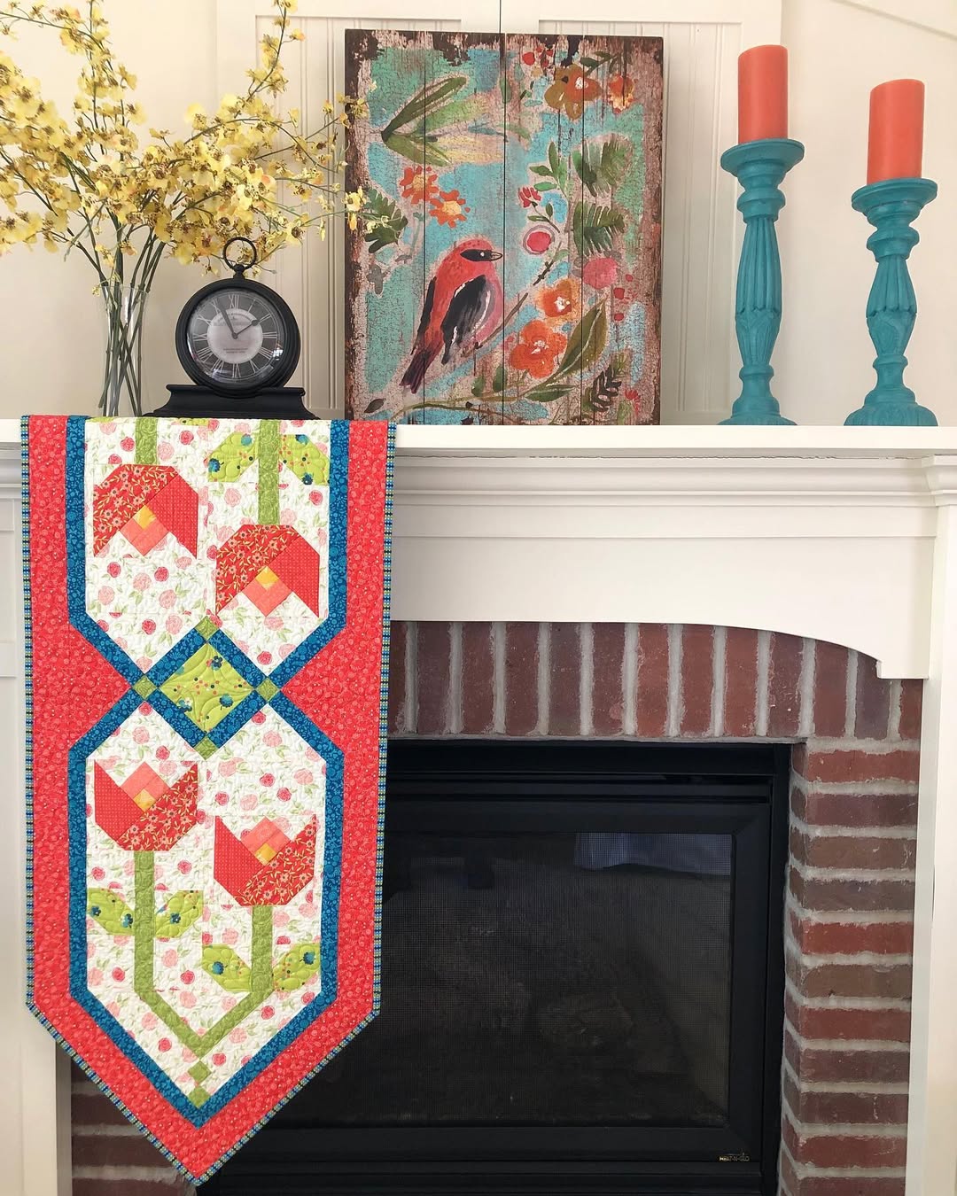 A quilted runner brings instant handmade charm to the mantel. Bold coral tulips and teal sashing create crisp contrast against the white trim and brick. Let it hang slightly off-center for that relaxed, heirloom feel. It’s a cozy, craft-forward swap that adds pattern without cluttering the top ledge.