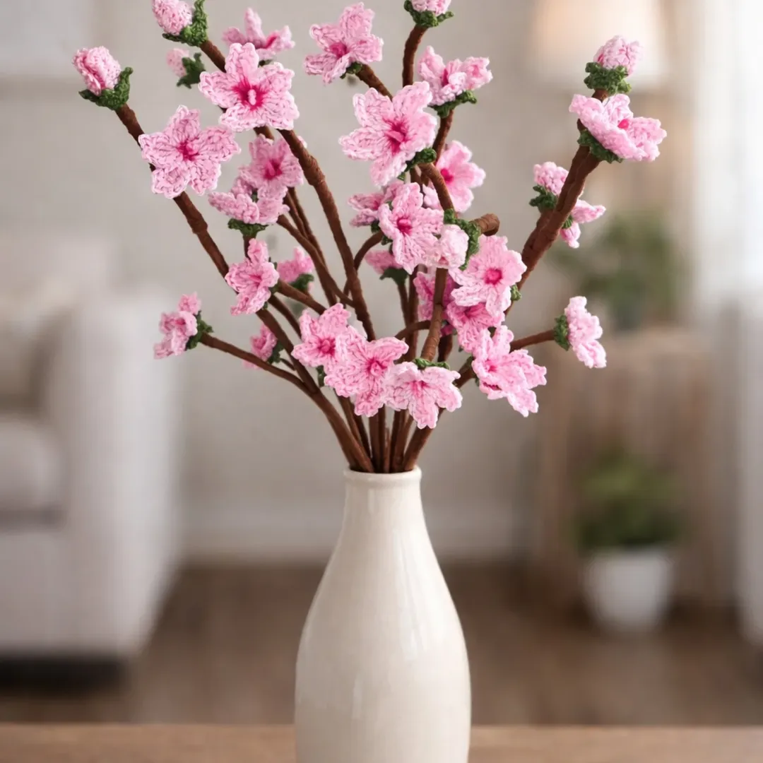Handmade cherry blossoms bring texture you can actually see and feel. The soft pink yarn pops against simple ceramic, making the arrangement look thoughtful, not fussy. Brown wrapped stems keep the branches sculptural and easy to shape. It’s a low-maintenance spring accent that’s perfect for gifting or batching for your next market.