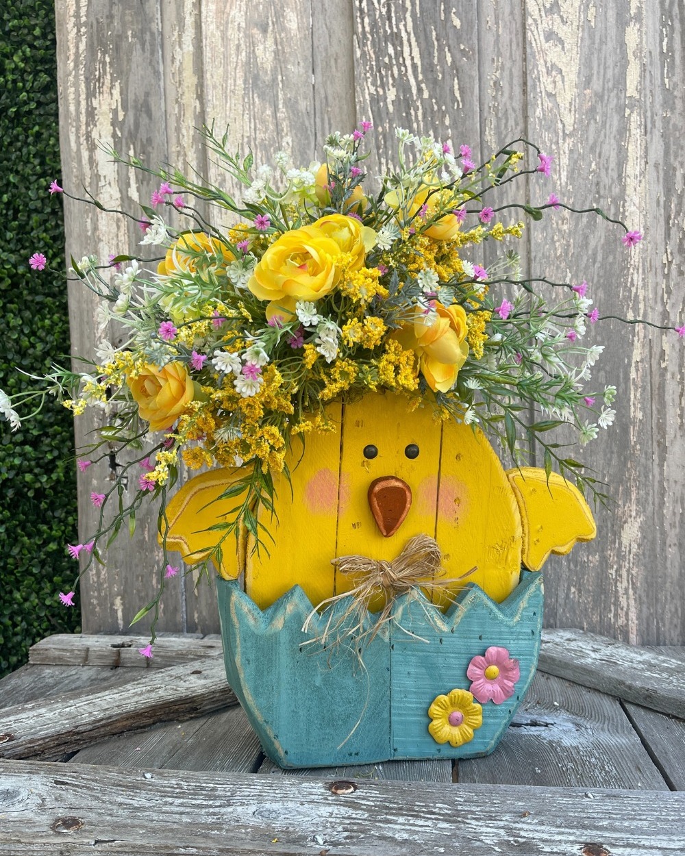 Bright yellow paint makes this shelf sitter an instant mood booster. The cracked egg base adds dimension and gives the piece that handmade, storybook feel. A wild spray of faux florals on top doubles as a built-in bouquet. Set it on a mantel or tiered tray when you want playful charm without overthinking the styling.