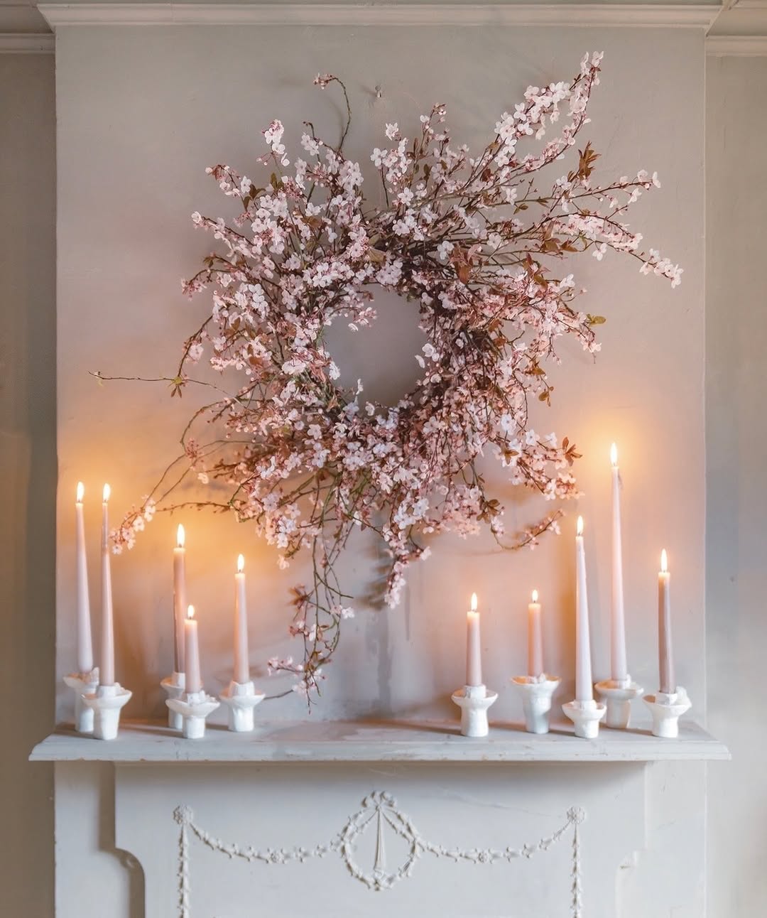 Cherry blossom branches turn a simple wreath form into a full-on spring statement. The loose, asymmetrical shape feels hand-gathered, which makes it perfect for a DIY that doesn’t look DIY. Taper candles in soft blush echo the florals and create that warm, market-stall glow buyers love. Pro tip: keep the palette tight and romantic so it feels boutique, not craft fair.