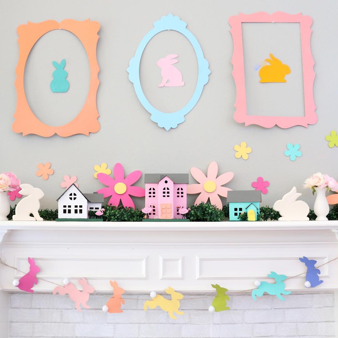 Pastel frames and bunny silhouettes make the spring base feel playful in seconds. Swap in a trio of cutout rabbits and suddenly the whole setup leans Easter. Mini painted houses add height and a storybook village vibe across the ledge. Finish with a rainbow bunny garland for movement, and the transition feels intentional, not overdone.