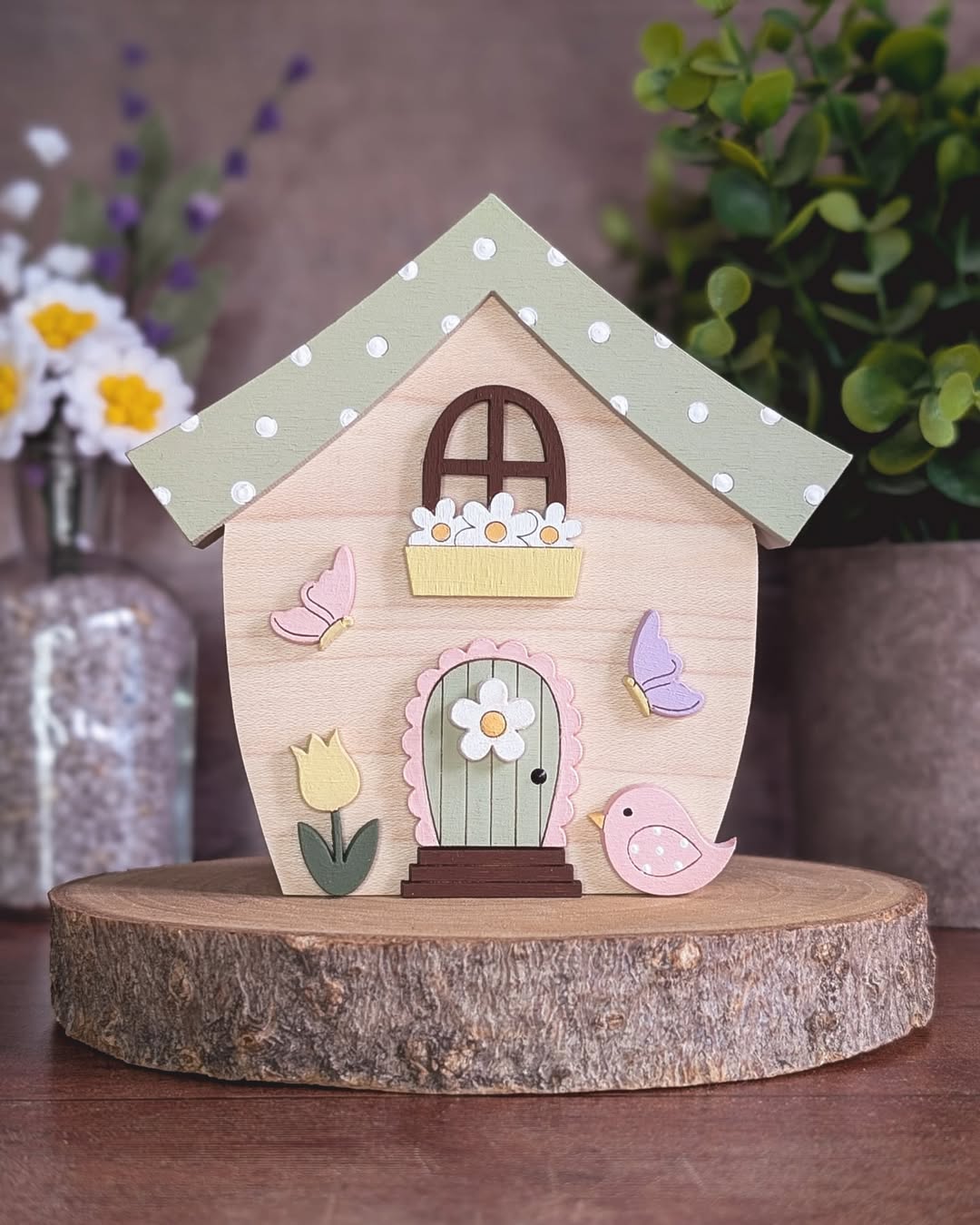 Soft pastel paint gives this little house its sweet, handcrafted appeal. Layered wood cutouts add dimension around the door, windows, and flower box. Tiny butterflies and a perched bird bring movement to the facade without cluttering it. Set on a wood slice base, it feels ready for a mantel, tiered tray, or market table.