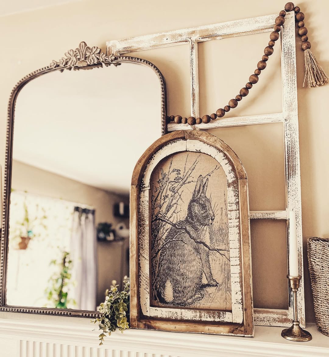 Layering an antique-style mirror with a distressed window frame gives this mantel instant depth. The arched rabbit print adds a soft woodland touch that feels subtle, not kitschy. Warm wood beads draped across the frame bring movement and texture up high. Keep the palette neutral and weathered so the spring theme feels timeless rather than trendy.