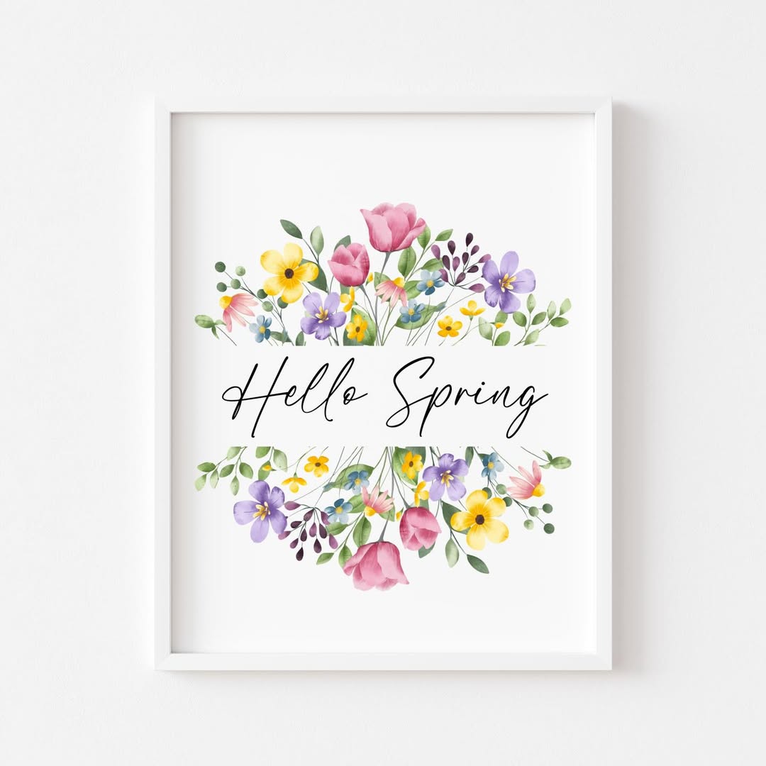 Soft watercolor florals frame the greeting like a fresh-picked bouquet. A crisp white mat and frame keep the look clean and easy to style on any mantel. The mix of tulips, violets, and sunny yellow blossoms adds layered color without feeling busy. This is the kind of printable art that sells fast because it works in almost any home.