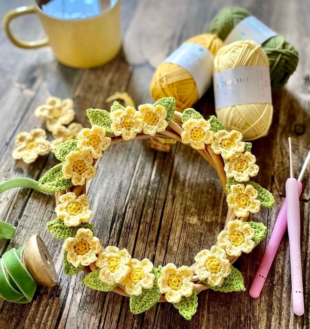 Crocheted primrose blooms wrap this grapevine wreath in pure spring optimism. Soft butter-yellow petals pop against fresh green leaves for that just-bloomed look. The natural twig base keeps it grounded and easy to hang on a mantel or door. It’s the kind of handmade piece that feels cheerful, giftable, and ready for market season.
