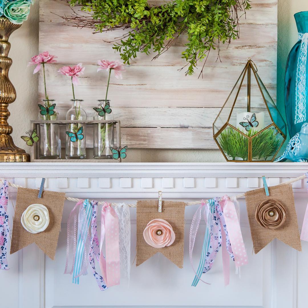 Burlap pennants instantly ground this mantel in that handmade, market-ready charm. Soft pink and aqua ribbons add movement and keep the palette feeling sweet, not saccharine. Glass bud vases lined in a wooden crate bring height and structure to the left side. The secret sauce is repetition—florals, butterflies, and blush tones echo just enough to make it feel styled, not scattered.