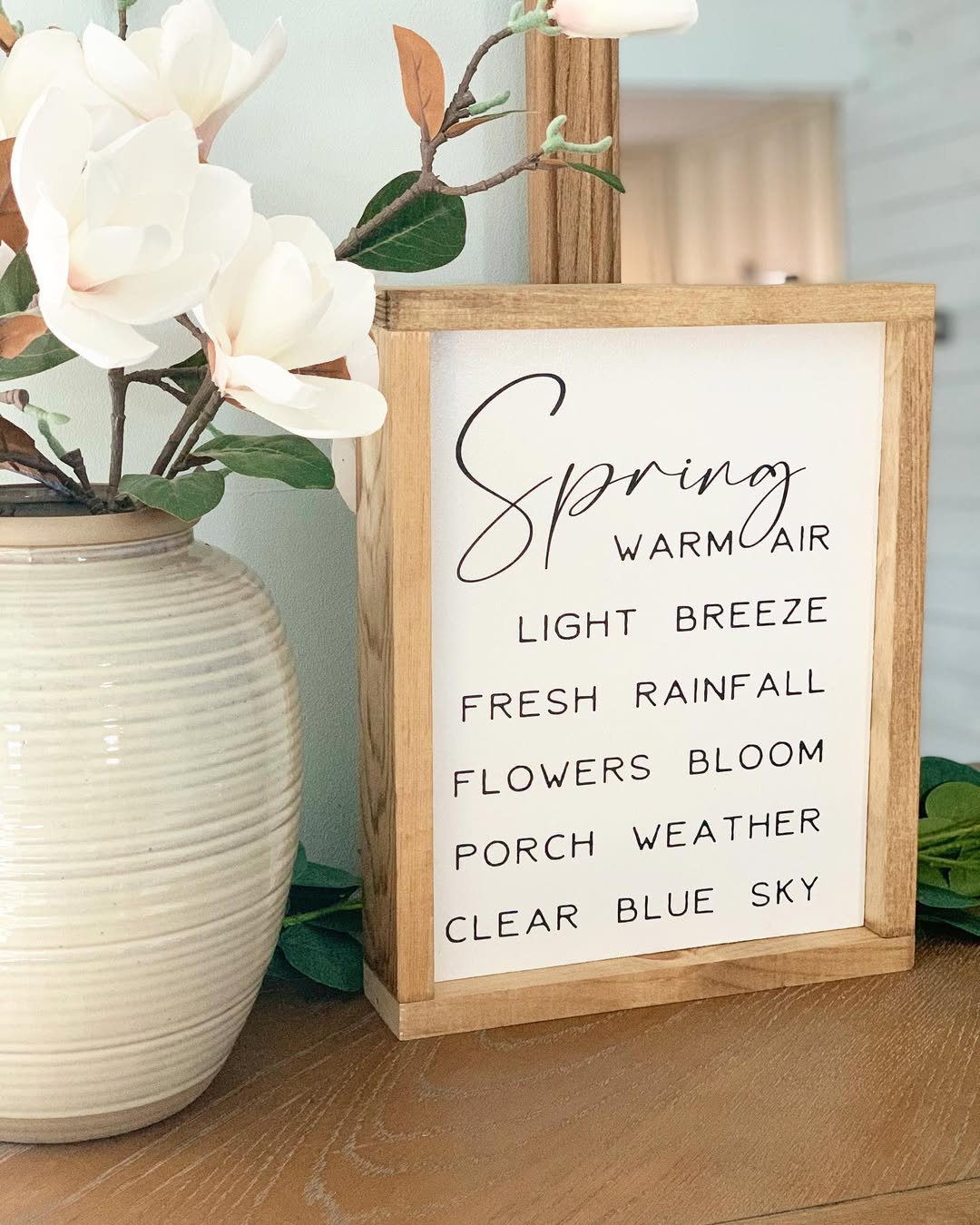 Script lettering turns a simple wood frame into instant seasonal decor. The black-on-white typography keeps it crisp and easy to reproduce for selling. A ribbed ceramic vase of faux magnolias softens the edges and adds that fresh-picked feel. Keep the palette neutral so it slips seamlessly onto any mantel, no styling degree required.