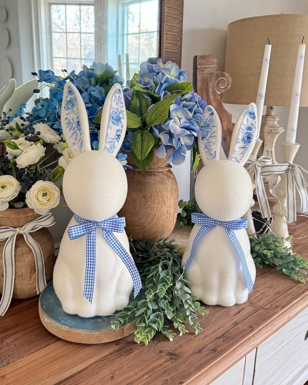 Gingham bows give these store-bought bunnies a sweet, cottage-core upgrade. The soft blue echoes the hydrangeas behind them and creates a pulled-together palette that feels intentional. Layered greenery at the base keeps the display from looking flat or overly precious. This is customization at its best—just ribbon, florals, and a glue gun turning basic into boutique-ready.