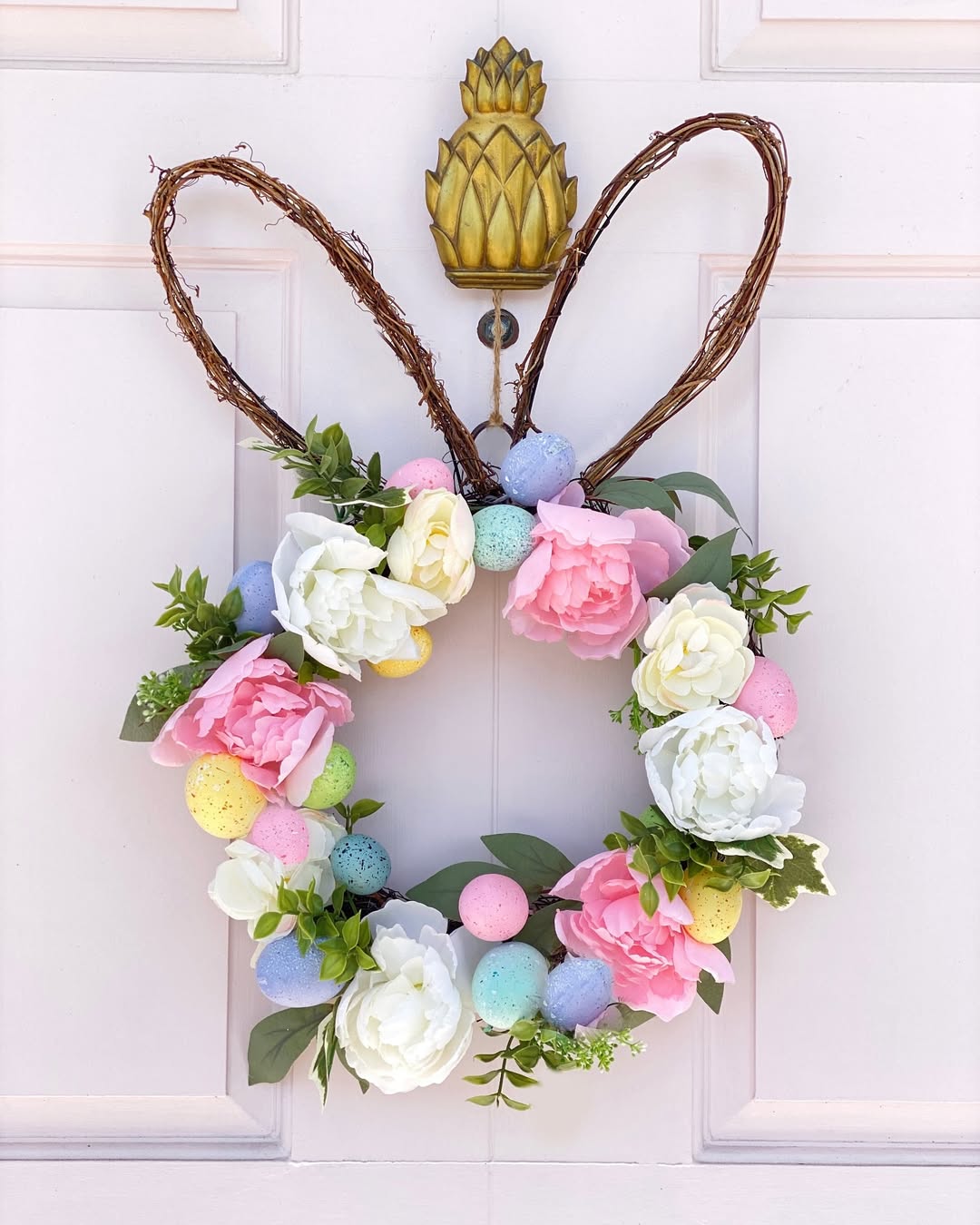 Twig loops turn this wreath into a playful nod to bunny ears without going full cartoon. Oversized peonies in blush and cream bring softness and serious curb appeal. Speckled pastel eggs tuck between the blooms for that just-hatched charm. Keep the florals clustered on the lower half so the silhouette stays clean and totally sellable.