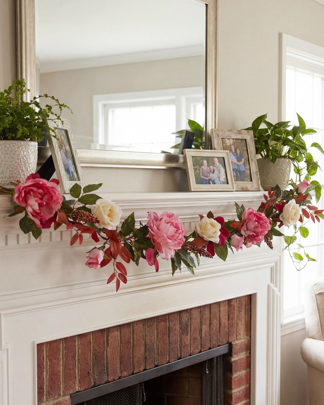 Skip the sparse greenery and go lush this season. A thick garland of peonies and roses drapes the mantel like it means it. Deep pinks and creamy whites pop against the crisp molding and warm brick. Let it run slightly asymmetrical for that relaxed, just-styled look buyers love.