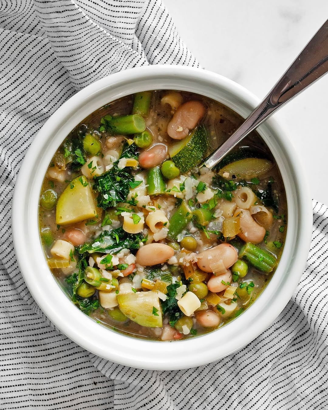 Beans and pasta make this one feel hearty without losing its spring identity. Zucchini, peas, and greens layer in that fresh-from-the-garden look. The broth stays light, letting every ingredient keep its shape and color. It’s the kind of soup that leans wholesome but still feels satisfying.