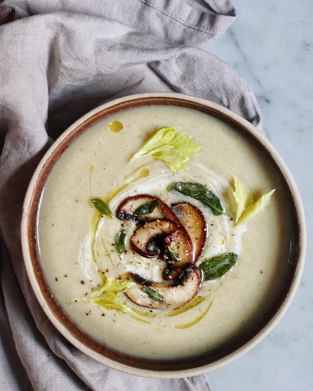That velvety base leans soft and neutral, letting the toppings do the storytelling. Caramelized mushroom slices bring depth and a slightly smoky edge. A swirl of cream adds movement without overcomplicating the bowl. It’s cozy, but styled with just enough drama to feel fresh.