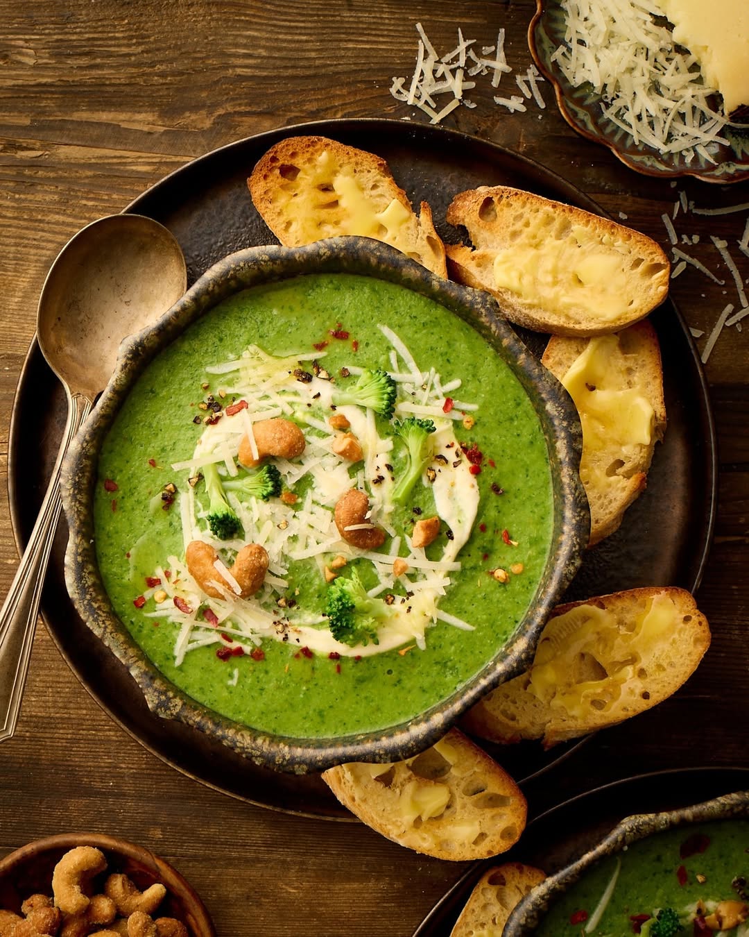 That vibrant green base leans rich thanks to the cheddar, but still reads fresh. Broccoli florets and shaved cheese on top double down on texture and flavor. Chili flakes sneak in a little heat to keep things interesting. And those buttery toast slices on the side? Non-negotiable.