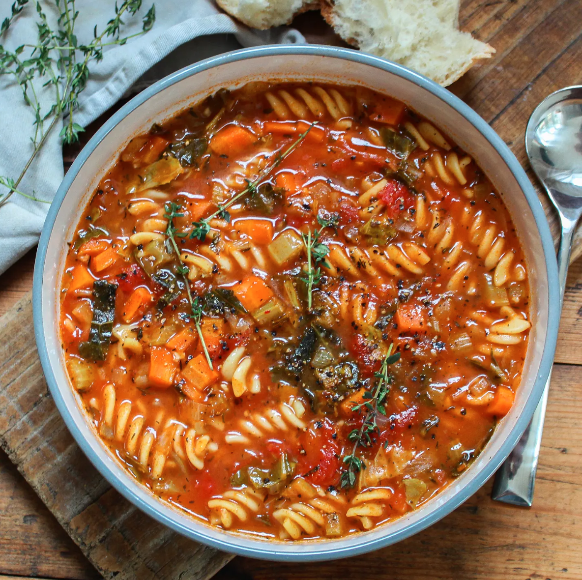 Rotini swirls through a tomato-rich broth that feels hearty but not heavy. Carrots, greens, and herbs keep the mix bright and seasonal. The texture lands somewhere between brothy and stew-like, which is exactly the point. It’s a classic, just loosened up for warmer days.