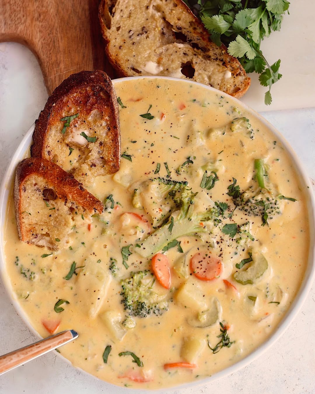 That thick, velvety base leans all the way into comfort-food territory. Broccoli florets keep it grounded with a bit of texture and color contrast. Carrot slices sneak in brightness without stealing focus. And those toasted bread slices on the side are clearly here for dipping duty.
