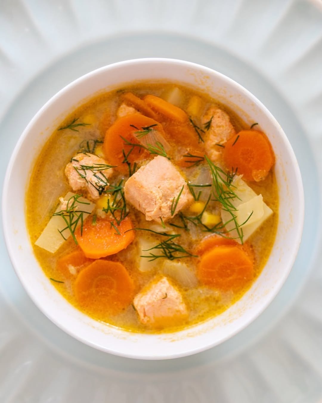 Salmon chunks bring richness, but the broth keeps things light and spring-ready. Carrot rounds and potatoes add softness without stealing the spotlight. Fresh dill scattered on top sharpens everything with a clean, herby finish. It’s simple, comforting, and quietly elegant.