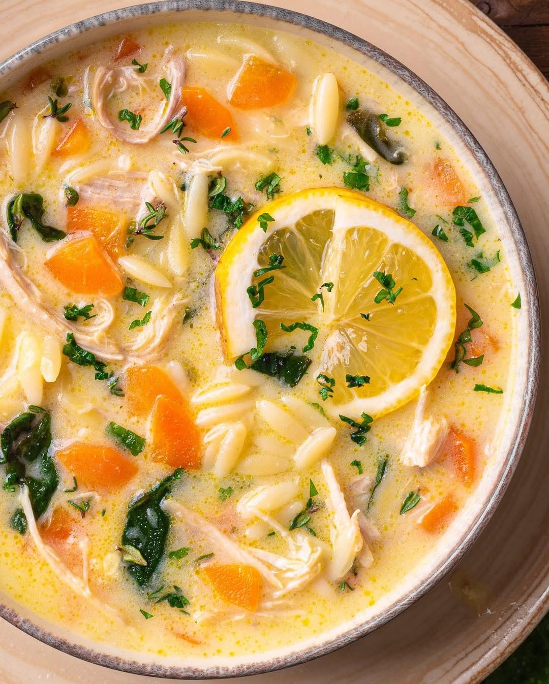 Bright lemon slices cut through the creamy broth, giving it that fresh, wake-up feel. Orzo keeps the texture light and a little playful instead of heavy. Shreds of chicken and pops of spinach round it out with just enough substance. It’s cozy, but clearly ready for sunnier days.