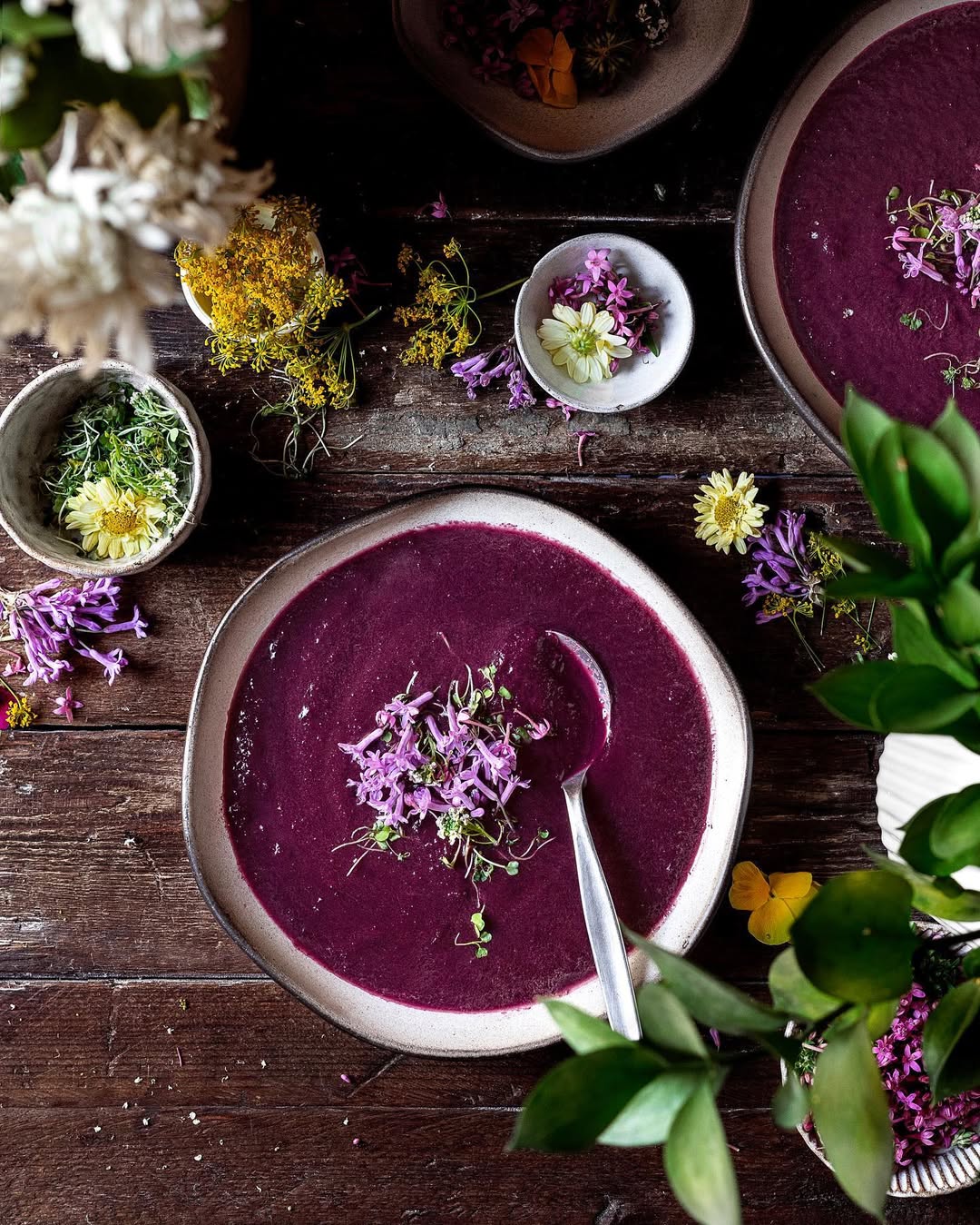 Deep purple sets the tone here, turning a simple puree into something almost cinematic. The glossy surface keeps it sleek, letting the color carry the mood. Scattered blossoms on top lean fully into that spring-meets-art vibe. It’s less soup, more edible still life.