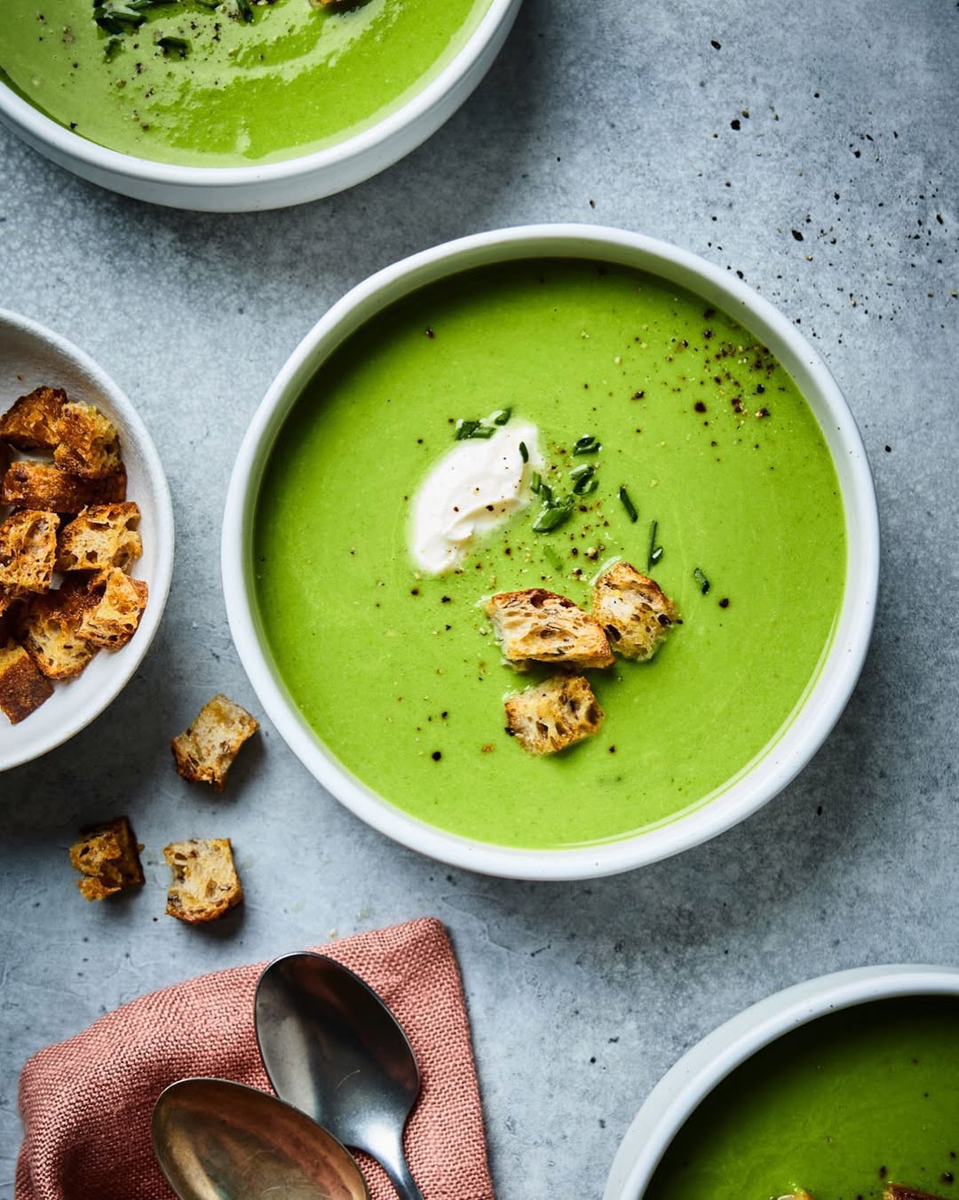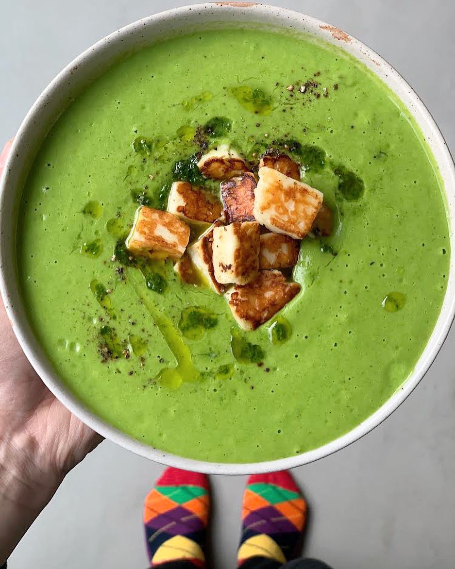 That ultra-smooth pea base leans into its color, bright and unapologetically fresh. A swirl of cream softens the look just enough without dulling the green. Golden croutons drop in for contrast and a little crunch moment. It’s simple, but it absolutely knows its angle.