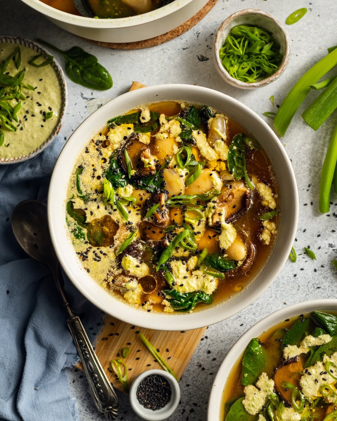 Miso-rich broth sets a deep, savory base that still feels light enough for spring. Butter beans add creaminess without turning the soup heavy. Mushrooms and greens layer in texture, keeping every bite interesting. A hit of spring onion pesto on top sharpens everything with a fresh, punchy finish.