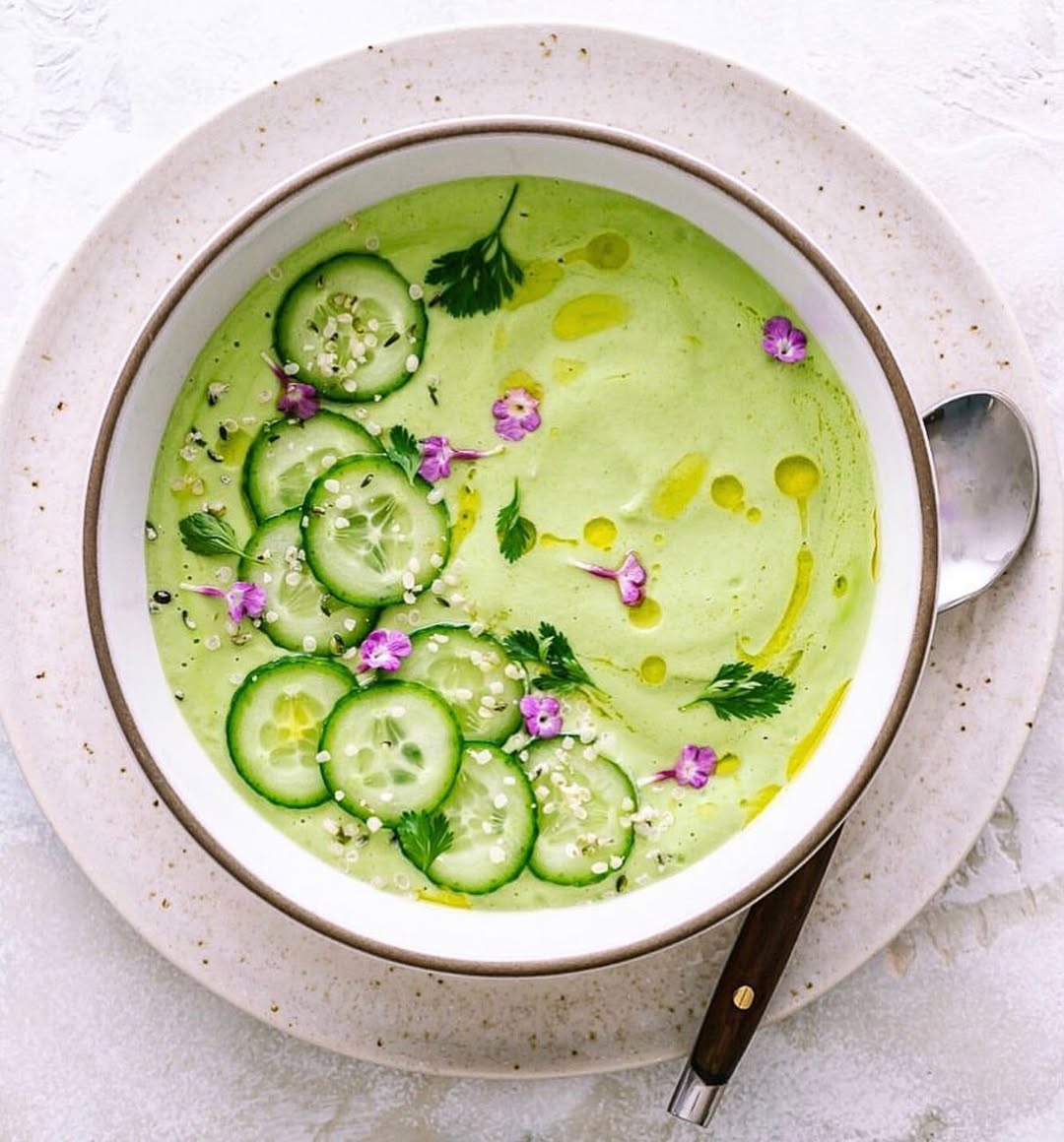 Cucumber slices, herb flecks, and that barely-there green make this feel like spring in soup form. The silky puree keeps the look clean, then the toppings add just enough texture to wake it up. Tiny edible flowers give the bowl a garden-party energy without tipping into fussy territory. It’s the kind of chilled recipe that looks refreshing before the first spoonful even happens.