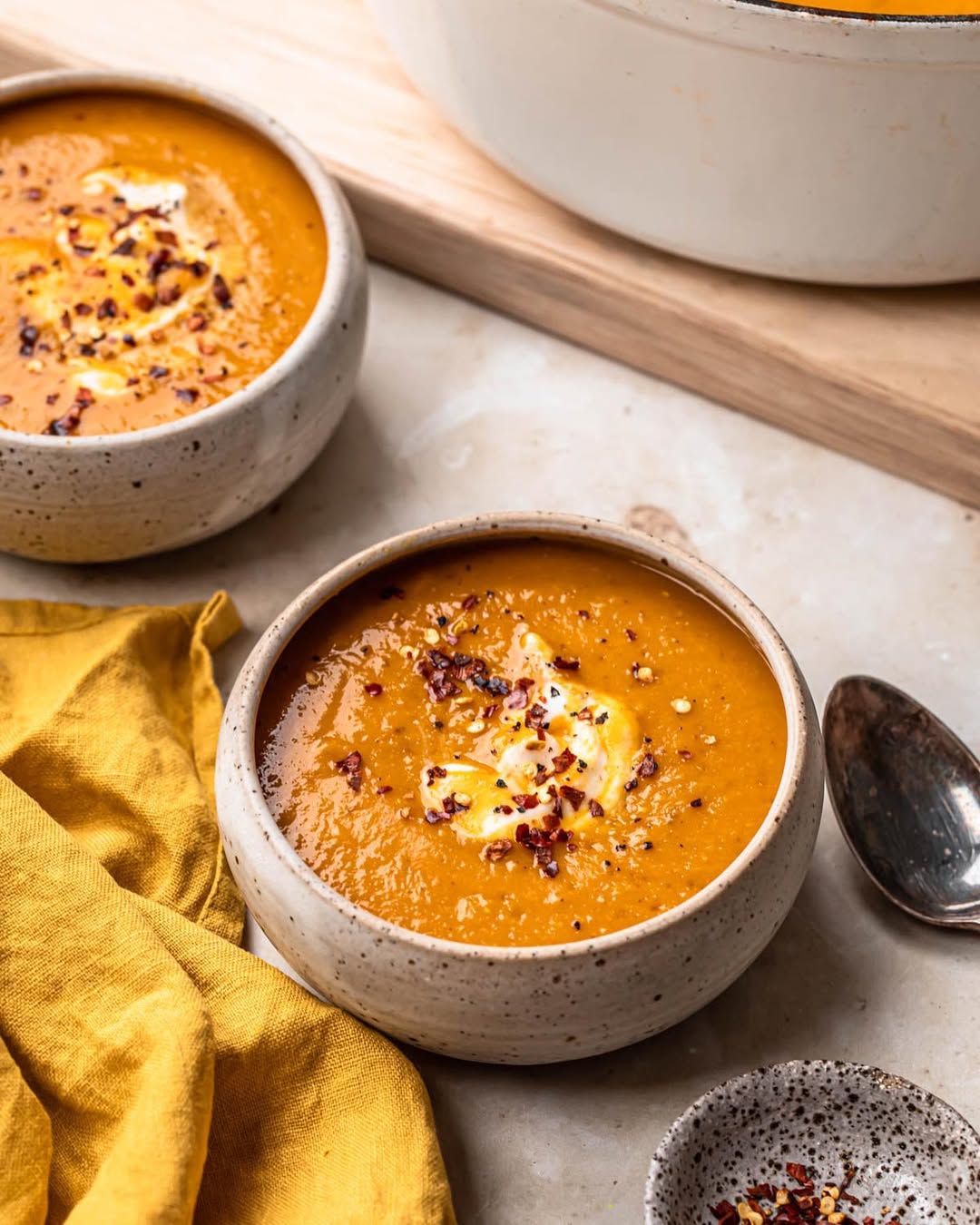 That deep orange base leans smooth and hearty without feeling too heavy. Lentils give it body, turning a simple puree into something more filling. A swirl of cream softens the spice just enough to balance it out. Chili flakes on top bring a subtle heat that keeps each spoonful interesting.