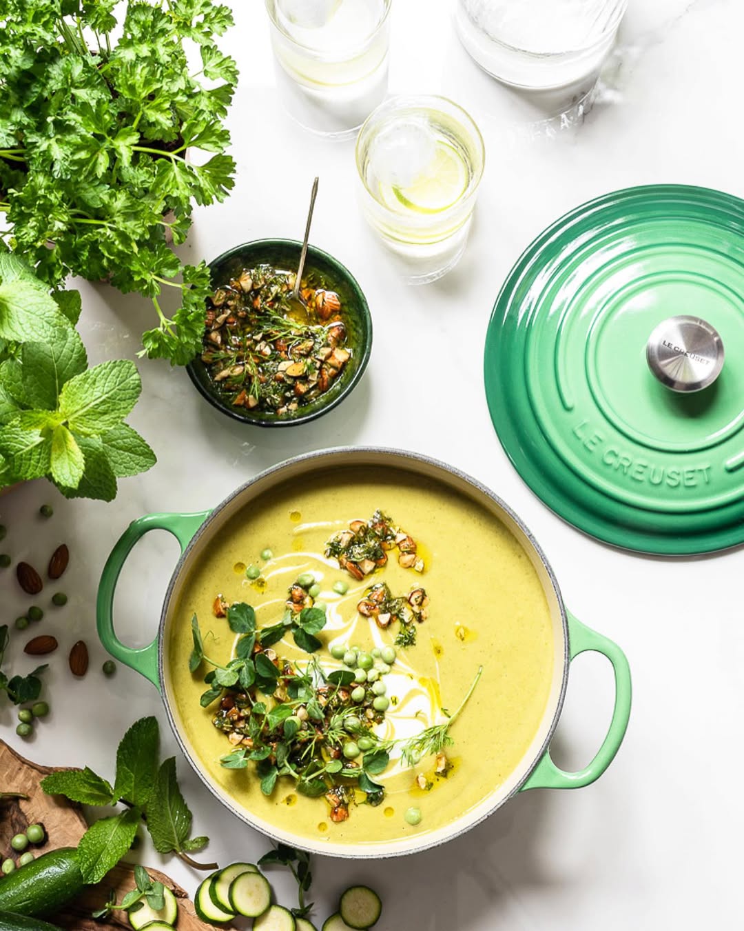 Zucchini and peas blend into a soft green base that feels light but still comforting. The surface stays silky, letting the color do most of the work. Fresh herbs and crunchy nut topping add contrast right at the center. It’s bright, clean, and made for longer days.