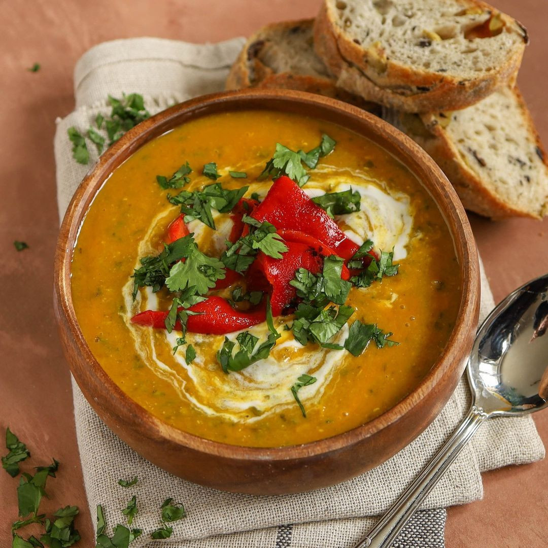 Warm orange tones set the base, hinting at layered spices without feeling heavy. A swirl of cream softens the look and adds a bit of movement. Roasted red peppers on top bring a bold, slightly smoky contrast. Fresh herbs finish it off with that bright, just-made energy.