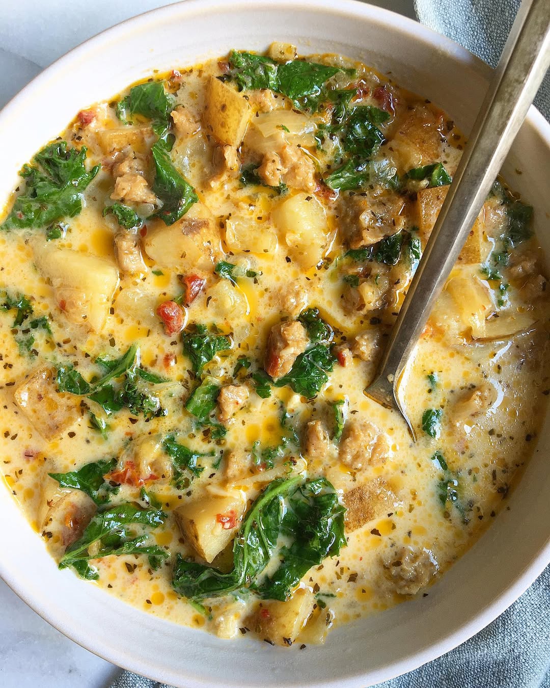 Potatoes and veggie sausage bring that hearty, stick-to-your-ribs energy. The creamy broth keeps everything rich, but not overly heavy. Kale folds in a fresh, slightly bitter note that balances it all out. Sundried tomatoes add little bursts of tangy depth that keep each bite interesting.