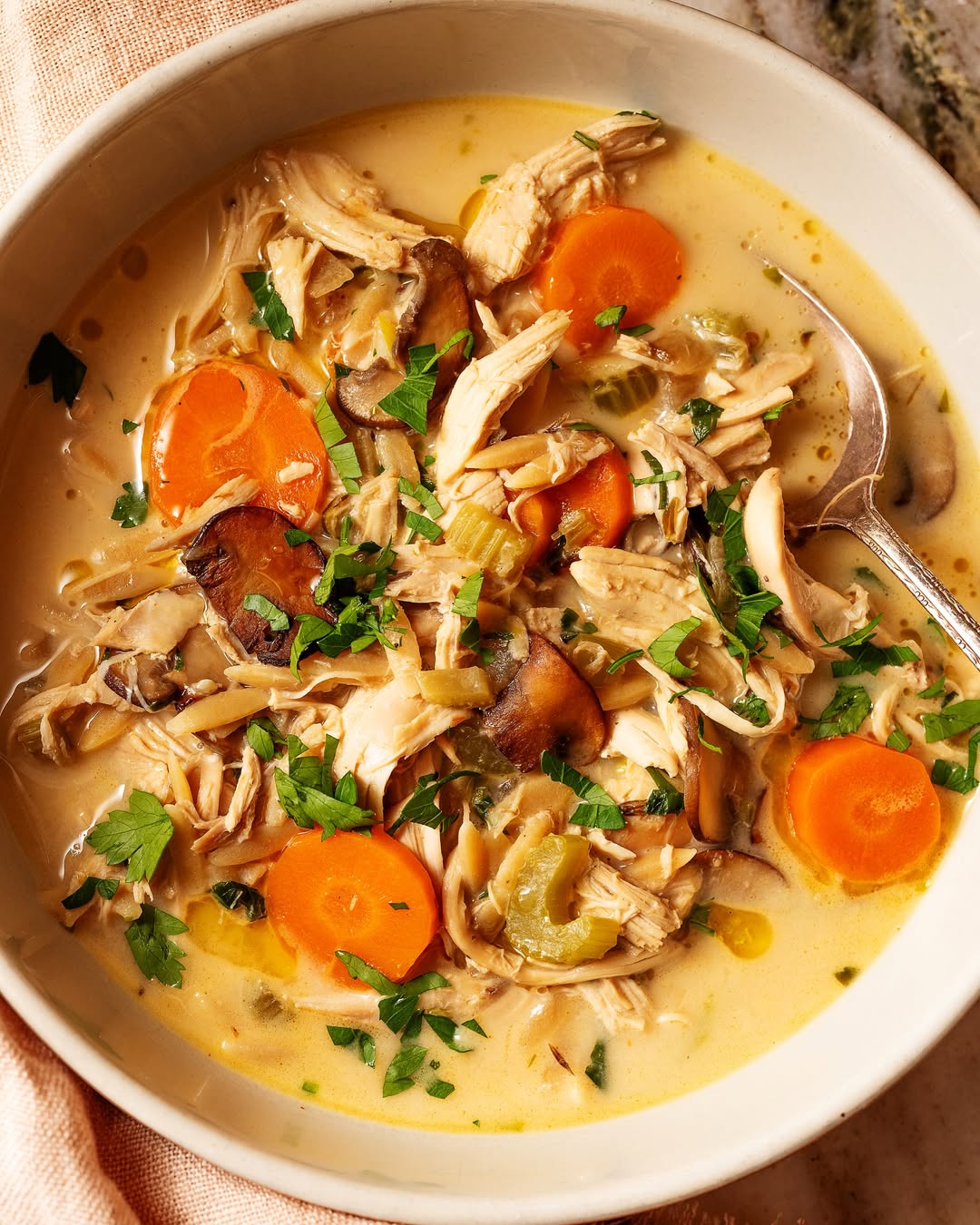 Lemon and tahini give the broth a silky, slightly tangy richness that feels unexpected. Shredded chicken keeps it hearty without weighing it down. Carrots and mushrooms add depth and a bit of bite. Fresh herbs on top bring it back to spring with a clean finish.