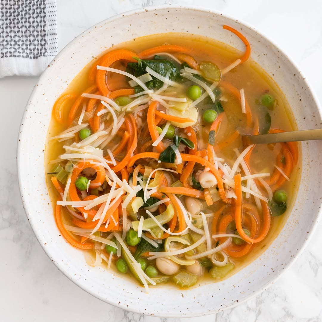 Carrot ribbons steal the show here, curling through the broth like bright orange confetti. The clear base keeps everything feeling light, letting peas, beans, and greens pop individually. Thin noodles add just enough substance without weighing the bowl down. It’s the kind of spring soup that eats like a reset button.