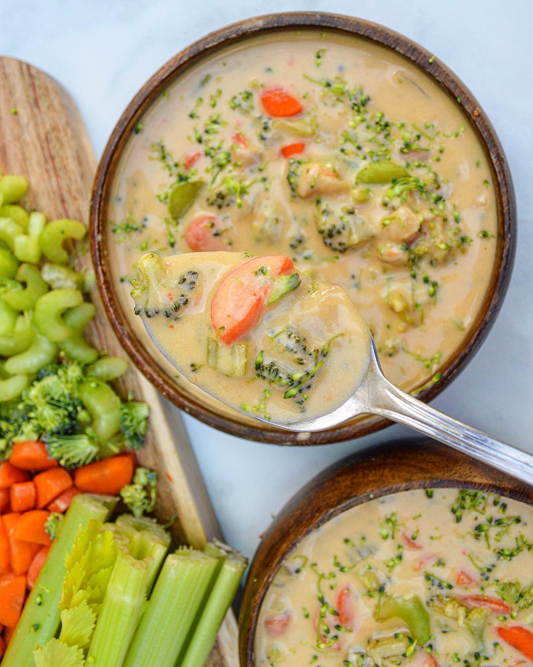 Broccoli takes center stage here, softened into a velvety base that still lets its texture peek through. The creamy, dairy-free broth gives it that classic comfort feel without weighing it down. Pops of carrot and celery keep the palette lively and unmistakably spring-forward. It’s cozy, but make it fresh.