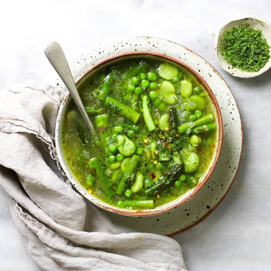 Peas, asparagus, and herbs pile in like a farmers’ market haul that skipped the bag. The broth stays clear and light, letting every shade of green feel crisp and distinct. Fresh dill scattered on top adds a sharp, almost citrusy lift. It’s spring in its brightest, most unapologetically green form.