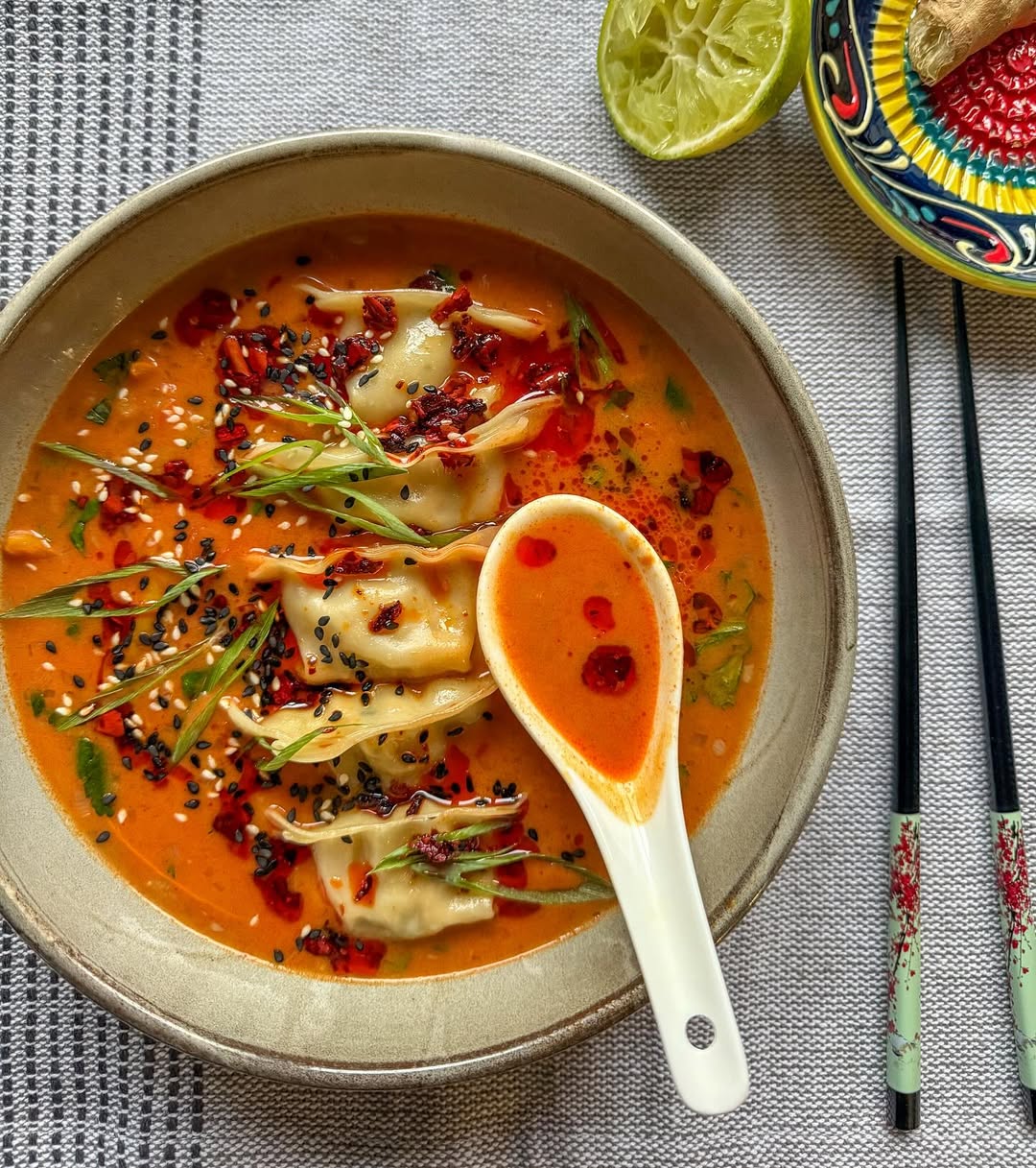 Chili oil swirls across the surface like it knows it’s the star. The dumplings anchor the bowl, turning a light broth into something way more satisfying. Sesame seeds and scallions layer in texture without cluttering the look. It’s bold, punchy, and definitely not your quiet spring soup.