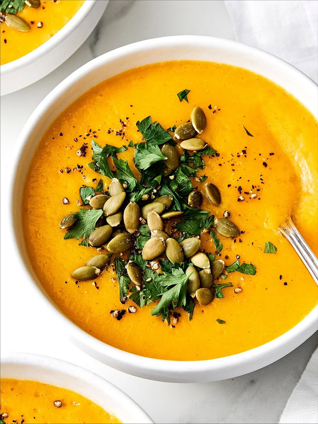 That golden-orange base brings instant warmth, like spring finally decided to show up. The puree is ultra-smooth, letting the color do most of the talking. Pepitas and chopped herbs land on top for a much-needed crunch and freshness. It’s cozy, but styled for brighter days ahead.