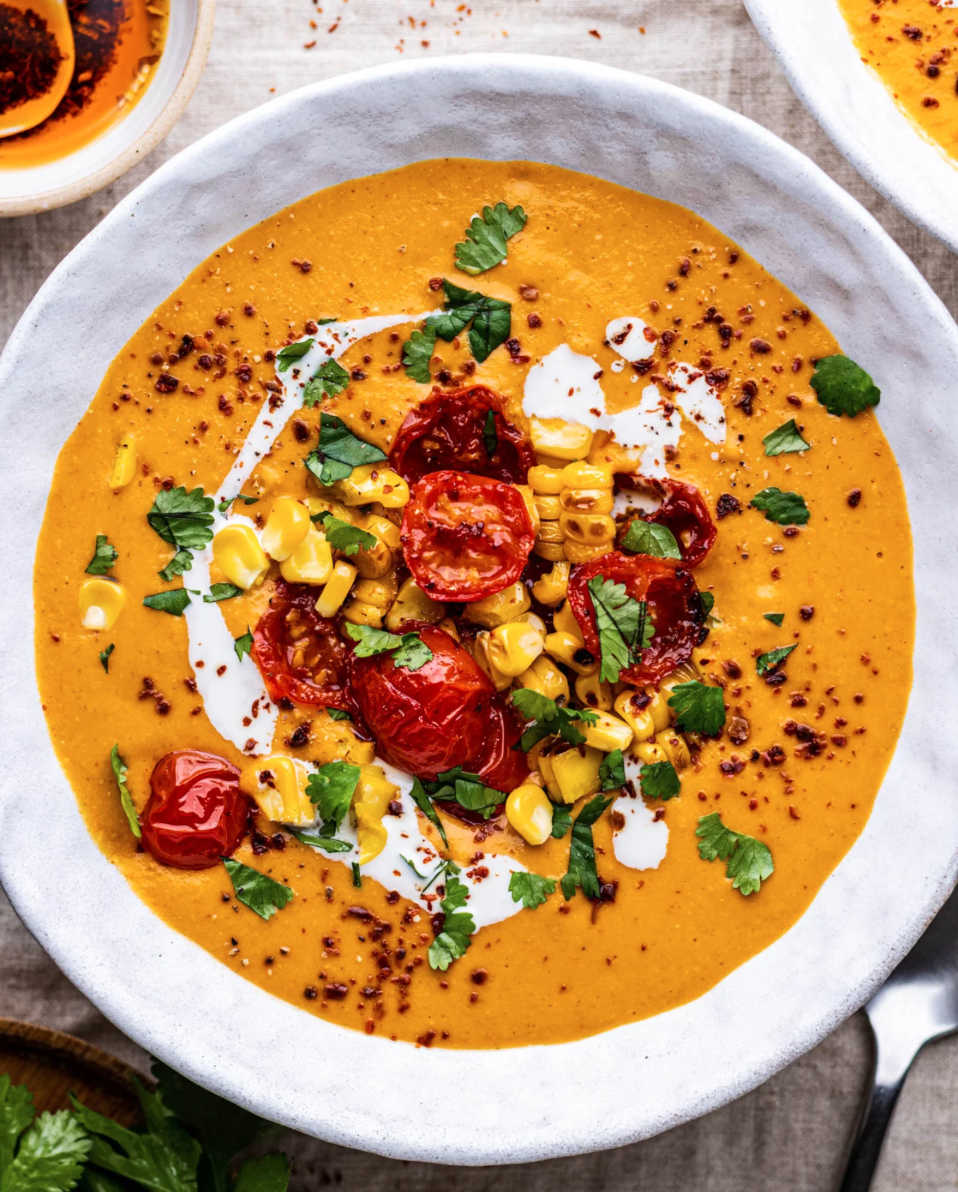 Roasted corn and blistered tomatoes bring that smoky, just-off-the-grill energy. The creamy base leans rich, but the lime and herbs keep it from feeling heavy. Chili flakes scattered on top add a subtle heat that sneaks up in the best way. It’s basically elote, reimagined for a bowl.