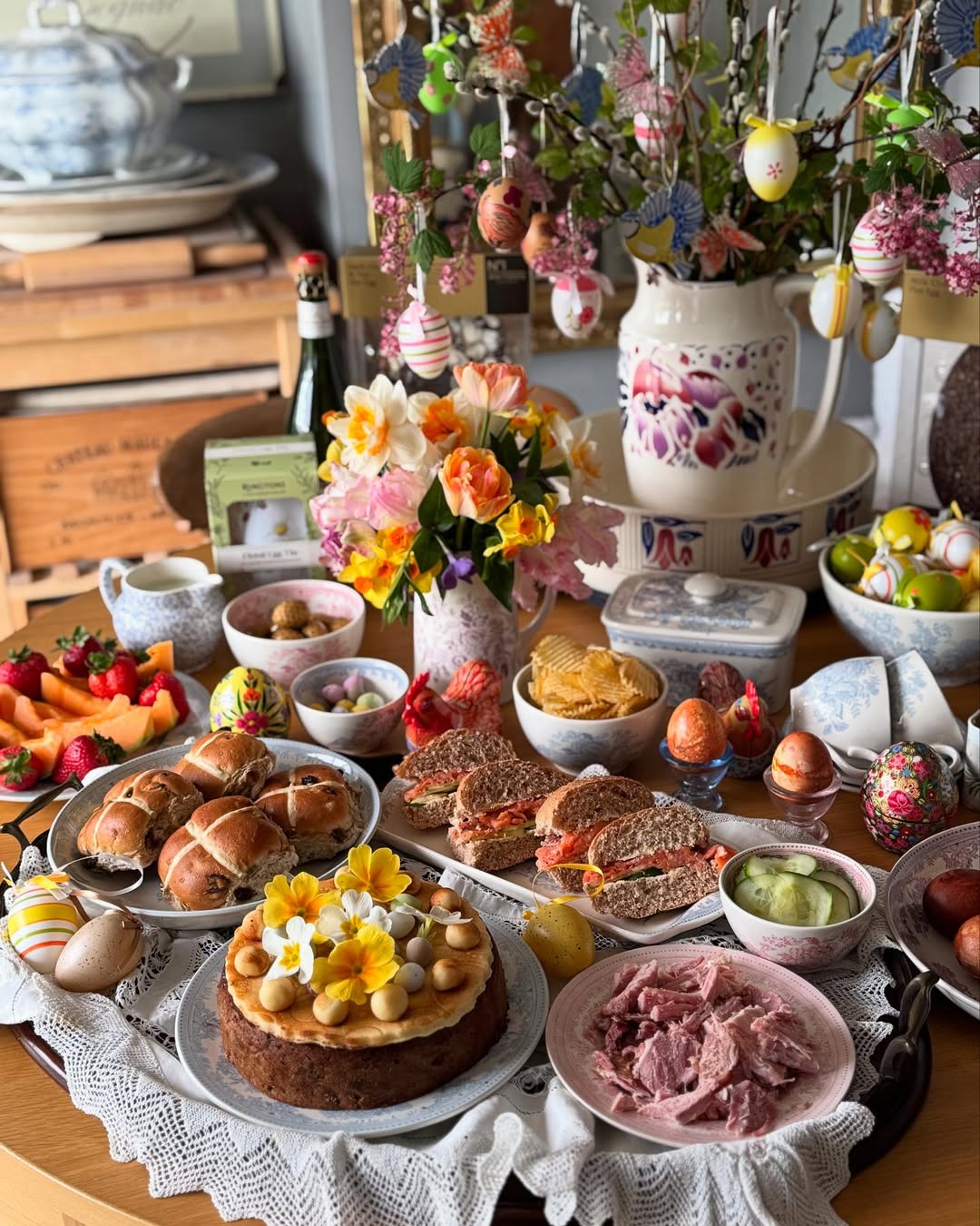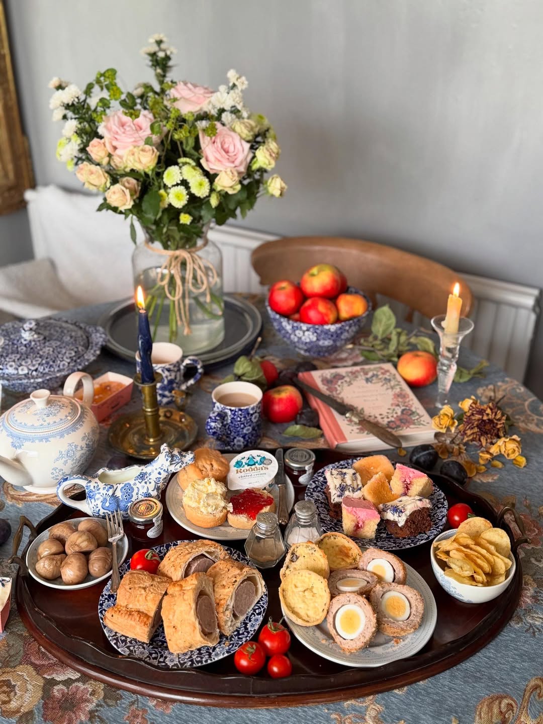 Swap dainty for hearty and let the food lead. Scotch eggs, pies, and thick-cut sandwiches turn this into a proper countryside spread. Blue-and-white ceramics add tradition without feeling too precious. It’s cozy, grounded, and built for lingering over second helpings.