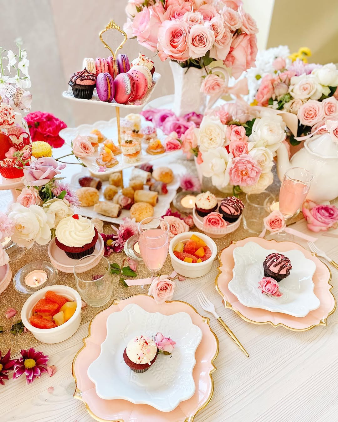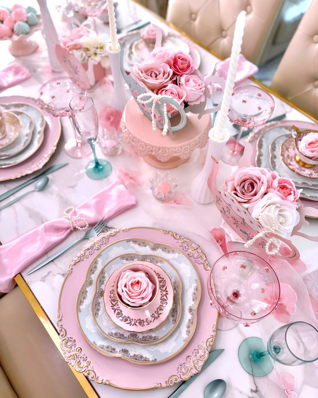 Pink is doing the heavy lifting here, and it’s doing it beautifully. Peonies, blush taper candles, rose-tinted glassware, and frosted cupcakes turn the table into a full-on spring fantasy. The gold accents keep all that sweetness from feeling flat. It’s feminine, festive, and just a little extra—in the best tea party way.
