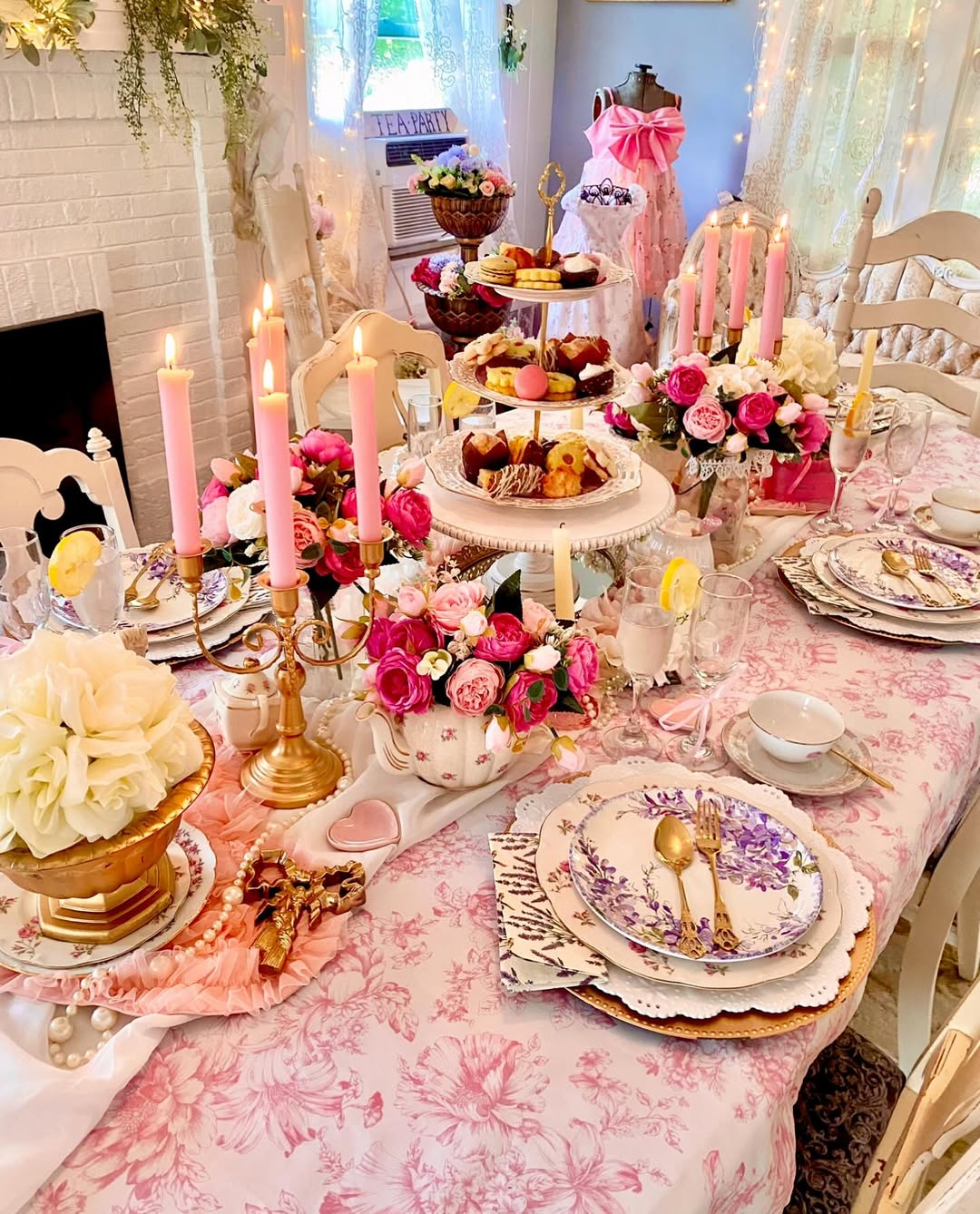 Start with lace and let everything layer from there. Floral china, pink roses, and tiered trays build a soft, collected look that feels timeless. The mix of patterns keeps it visually rich without tipping into clutter. It’s classic tea party styling with a romantic, heirloom twist.
