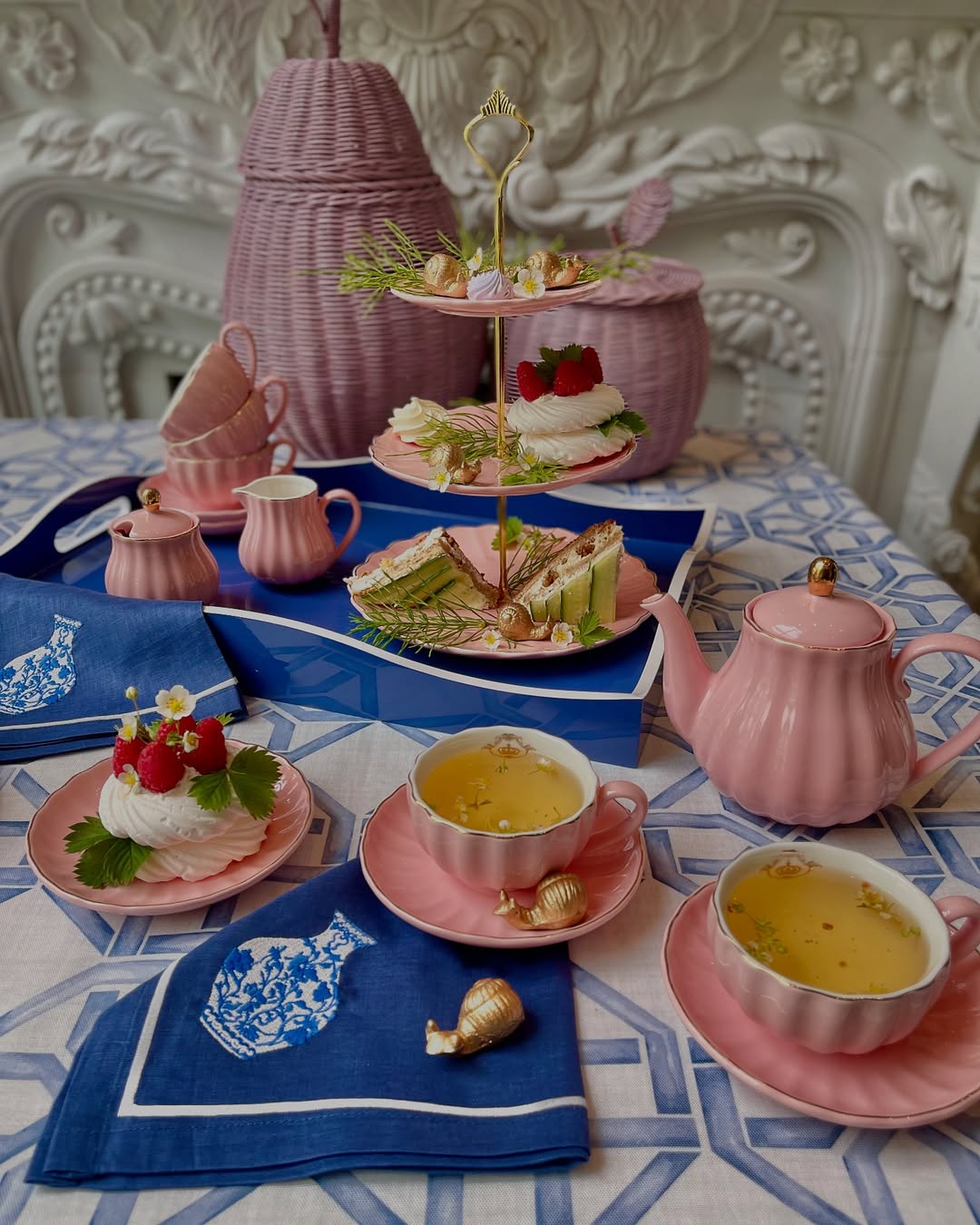 Try breaking the all-pink rule for a fresher take. A bold blue tray and napkins cut through the sweetness of blush ceramics and florals. The tiered stand keeps things classic, but the color contrast makes it feel updated. It’s a spring table that knows how to mix it up.