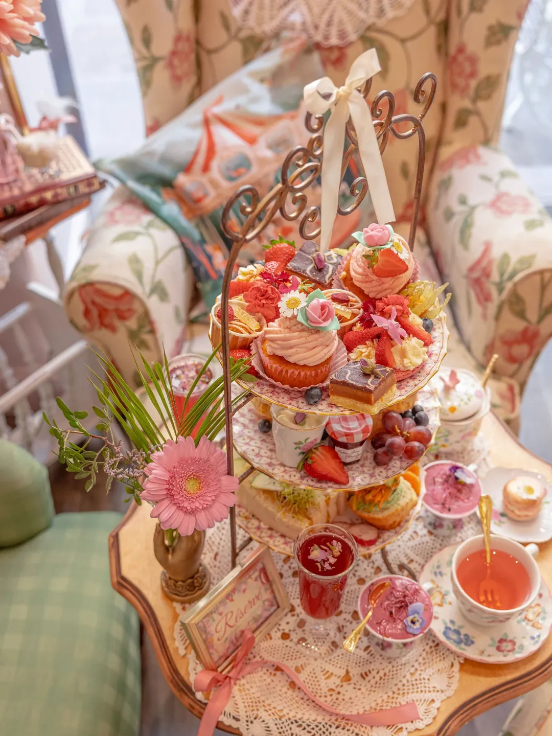 Bring the tea party off the table and into its own moment. A tiered stand packed with colorful pastries turns this side setup into a destination. The vintage armchair and lace details add a cozy, almost storybook backdrop. It’s intimate, indulgent, and perfect for slow sipping.