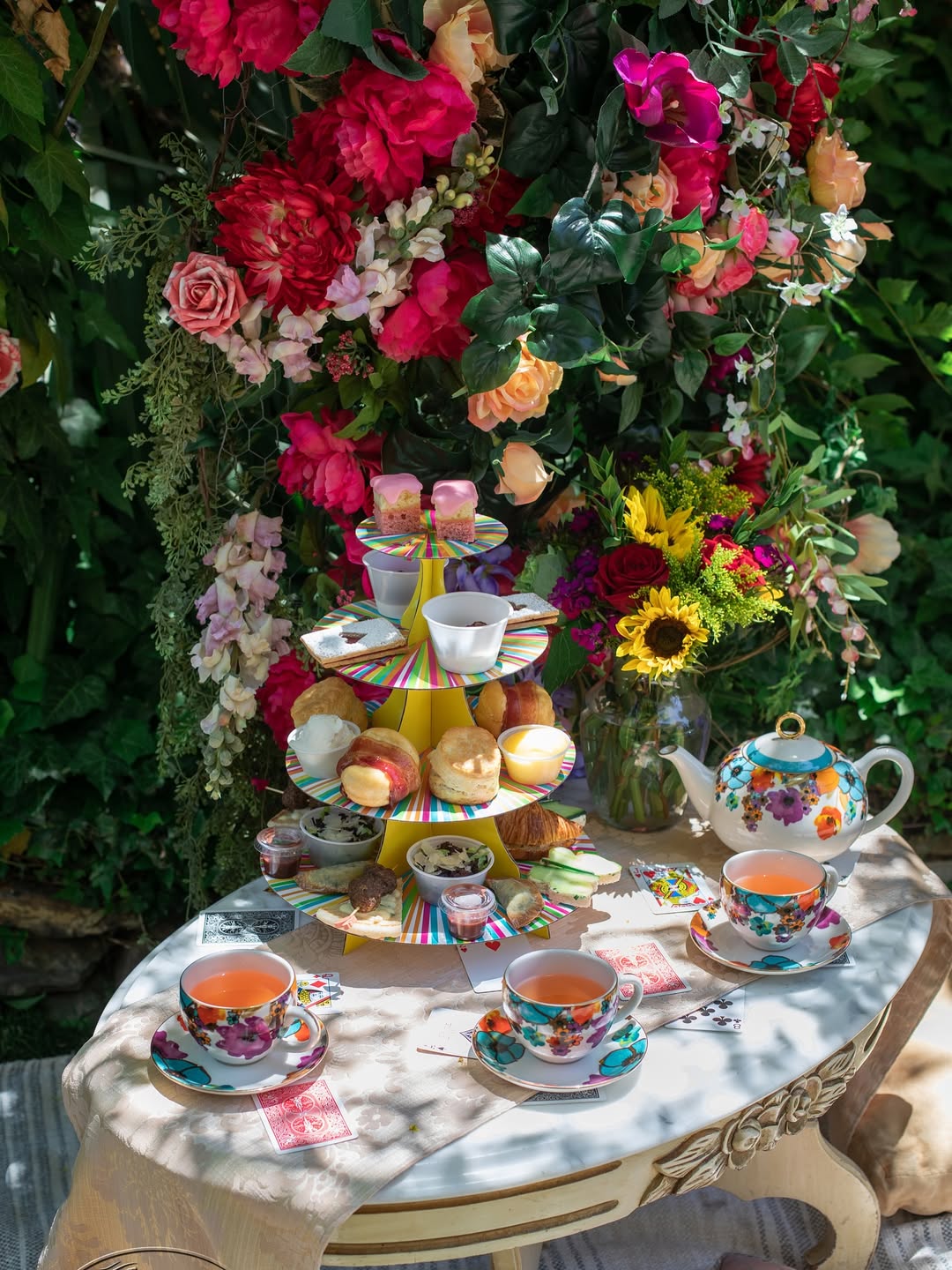 Feels like you’ve stepped into a whimsical story. A rainbow-tiered stand pops against the lush, overflowing florals behind it. Bold patterned teacups echo the playful color story without clashing. It’s vibrant, a little eccentric, and made for a tea party that doesn’t take itself too seriously.