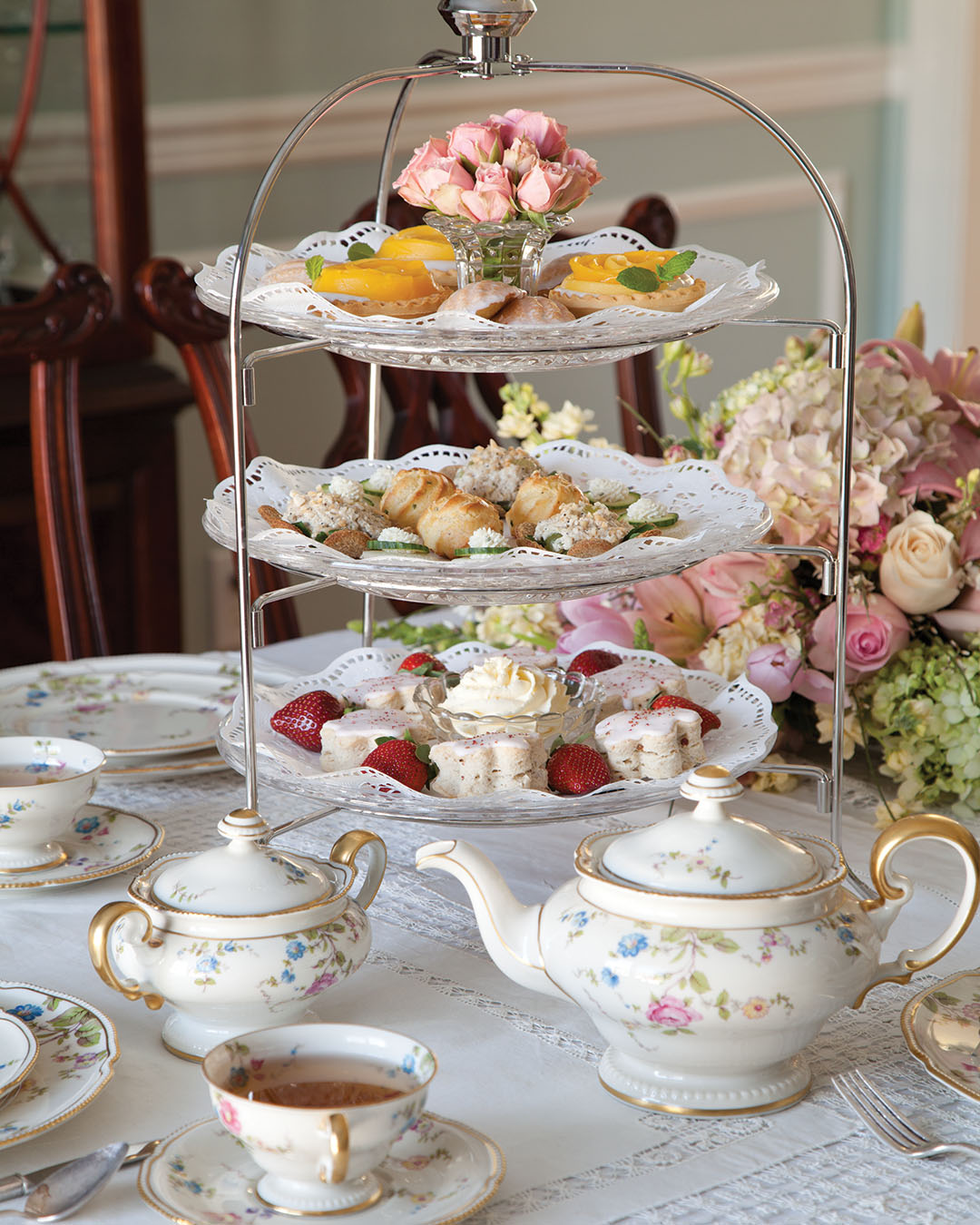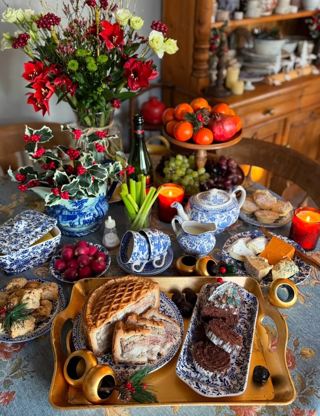 Deep reds and greenery shift the mood into something richer. Blue-and-white china keeps the setup grounded and timeless against the seasonal accents. Layered platters of pies, cakes, and savory bites make it feel generous and inviting. It’s spring tea with a hint of holiday warmth.