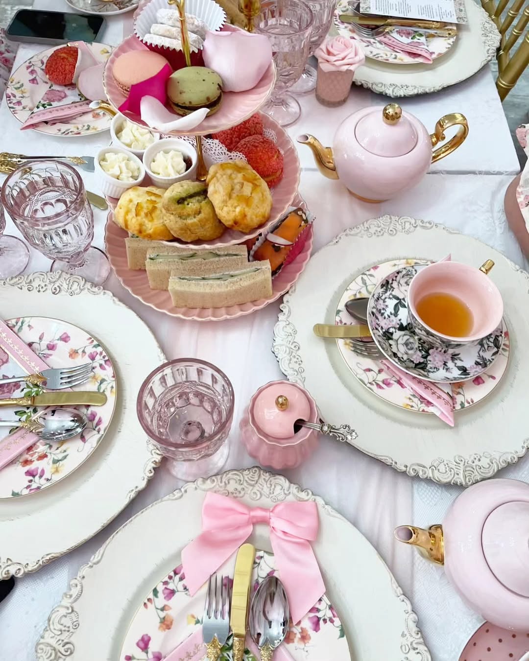 Start with soft details that feel intentional. Satin bows at each place setting instantly add a dressed-up, almost present-like touch. The blush teapot and tiered tray keep the palette cohesive without trying too hard. It’s delicate, polished, and just playful enough to feel special.