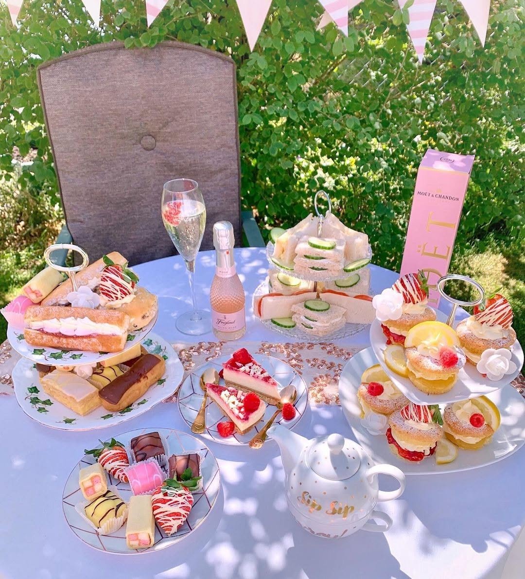 Take it outside and let the setup feel celebratory. Pink bubbly, berry-topped desserts, and tiered stands turn this into a tea party with a party twist. The soft palette keeps it cohesive even with all the variety. It’s bright, playful, and made for toasting between bites.